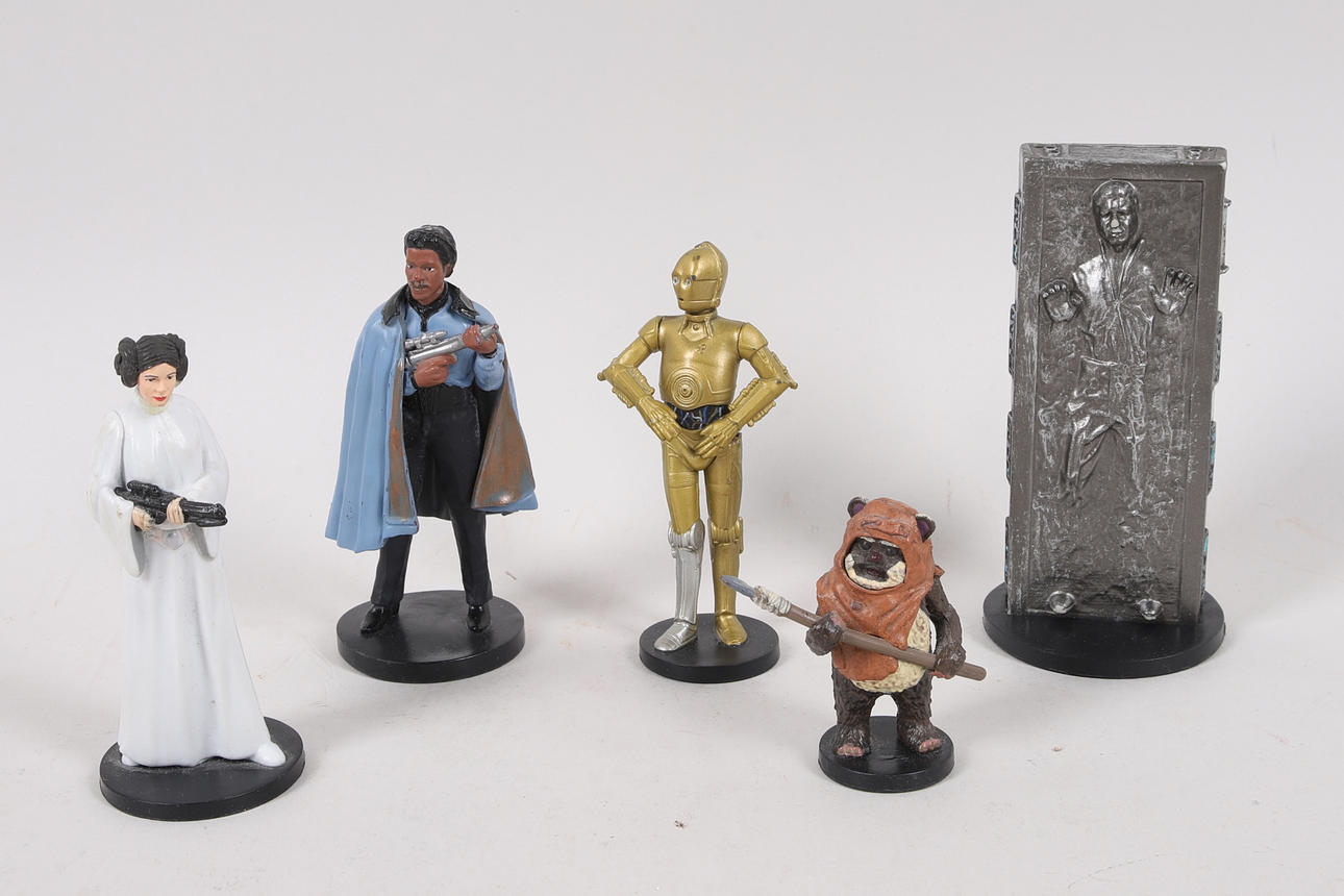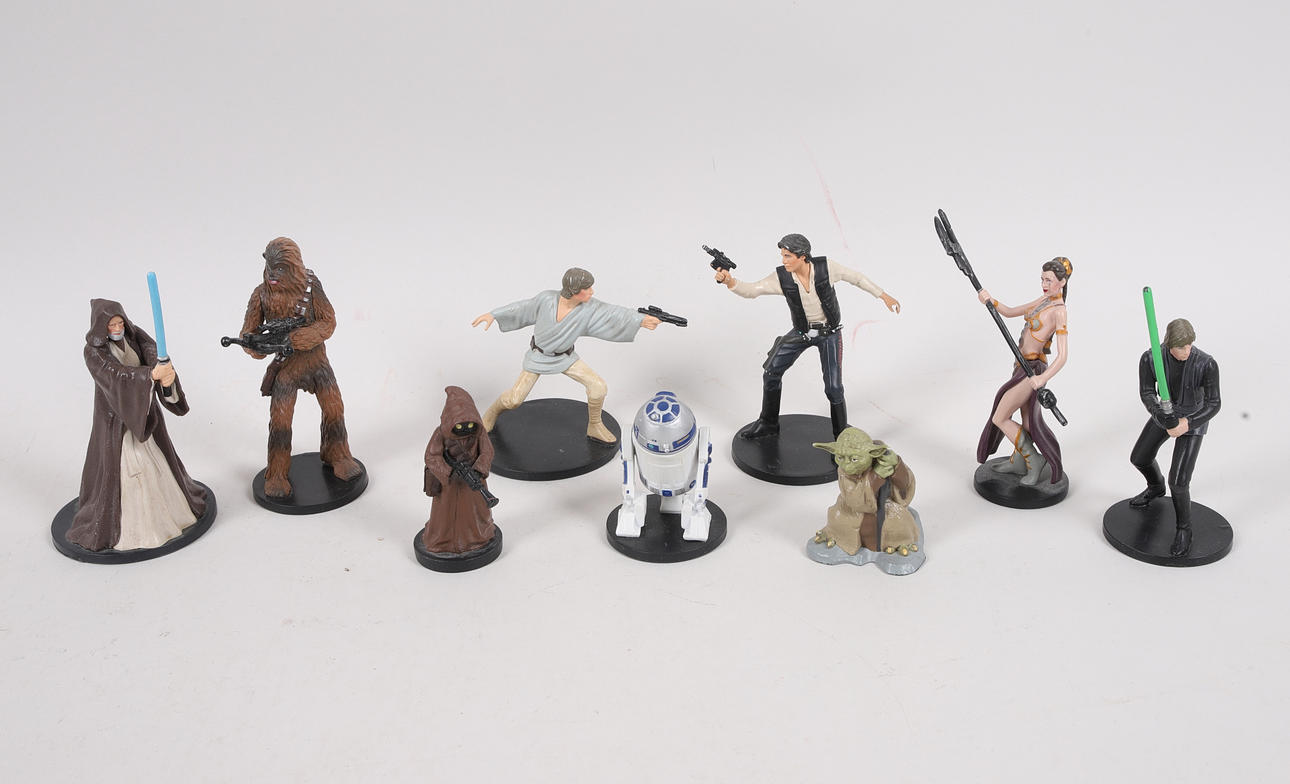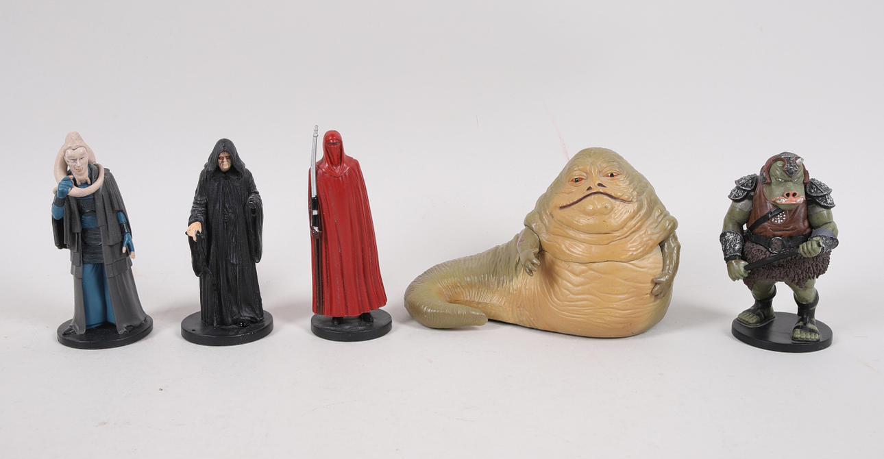 Bruksslitage, ytsmuts, repor, färgskav, spricka i huvudet på Bib Fortuna, skador och saknade delar på några figurer.