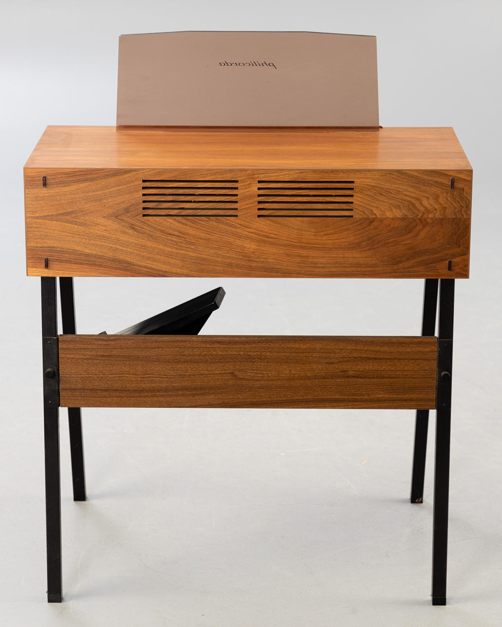 valnötsfanér. Svart lackerad stålram.