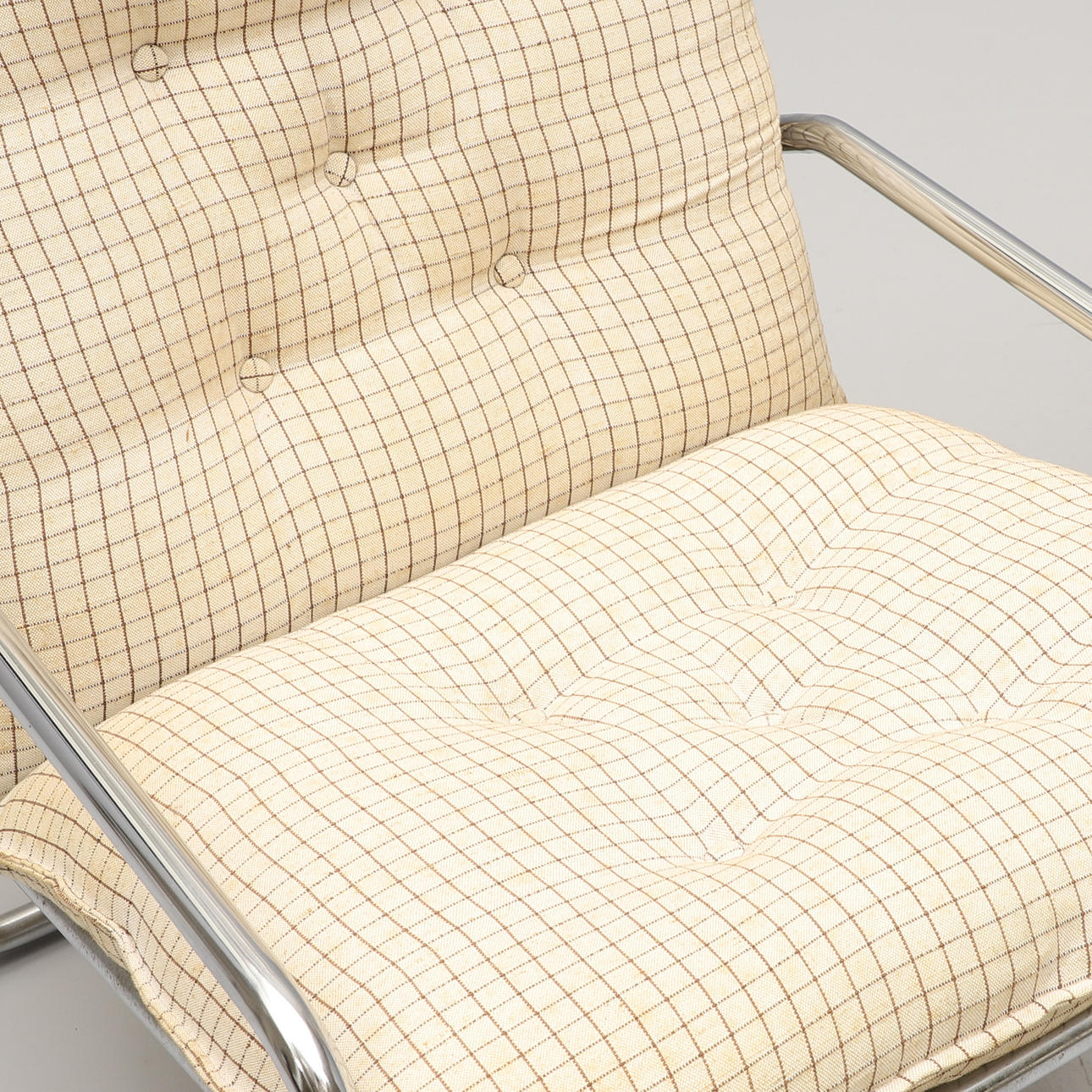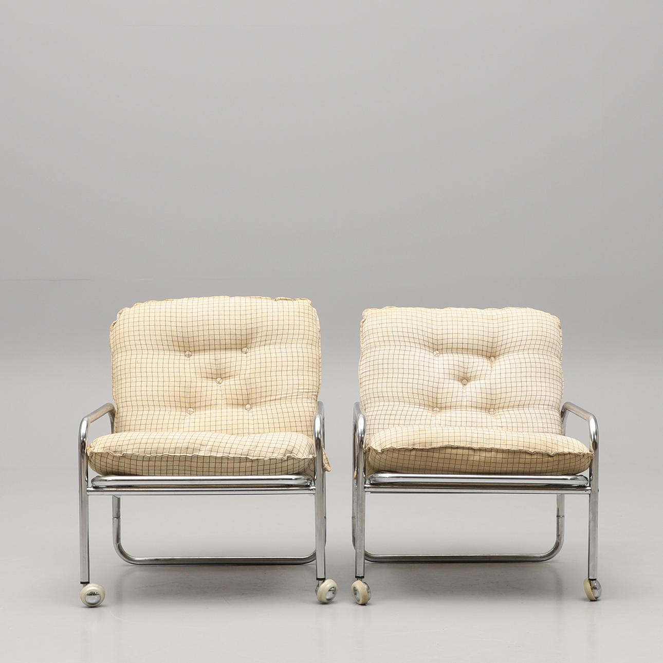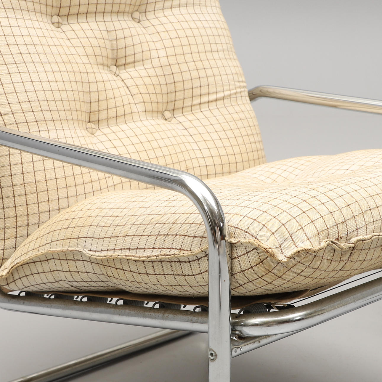 Stomme av kromad metall med hjul framtill, kanvas. Lös stoppad dyna. Sitthöjd 48, rygghöjd 78, bredd 64 cm.