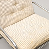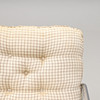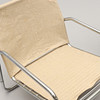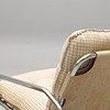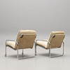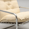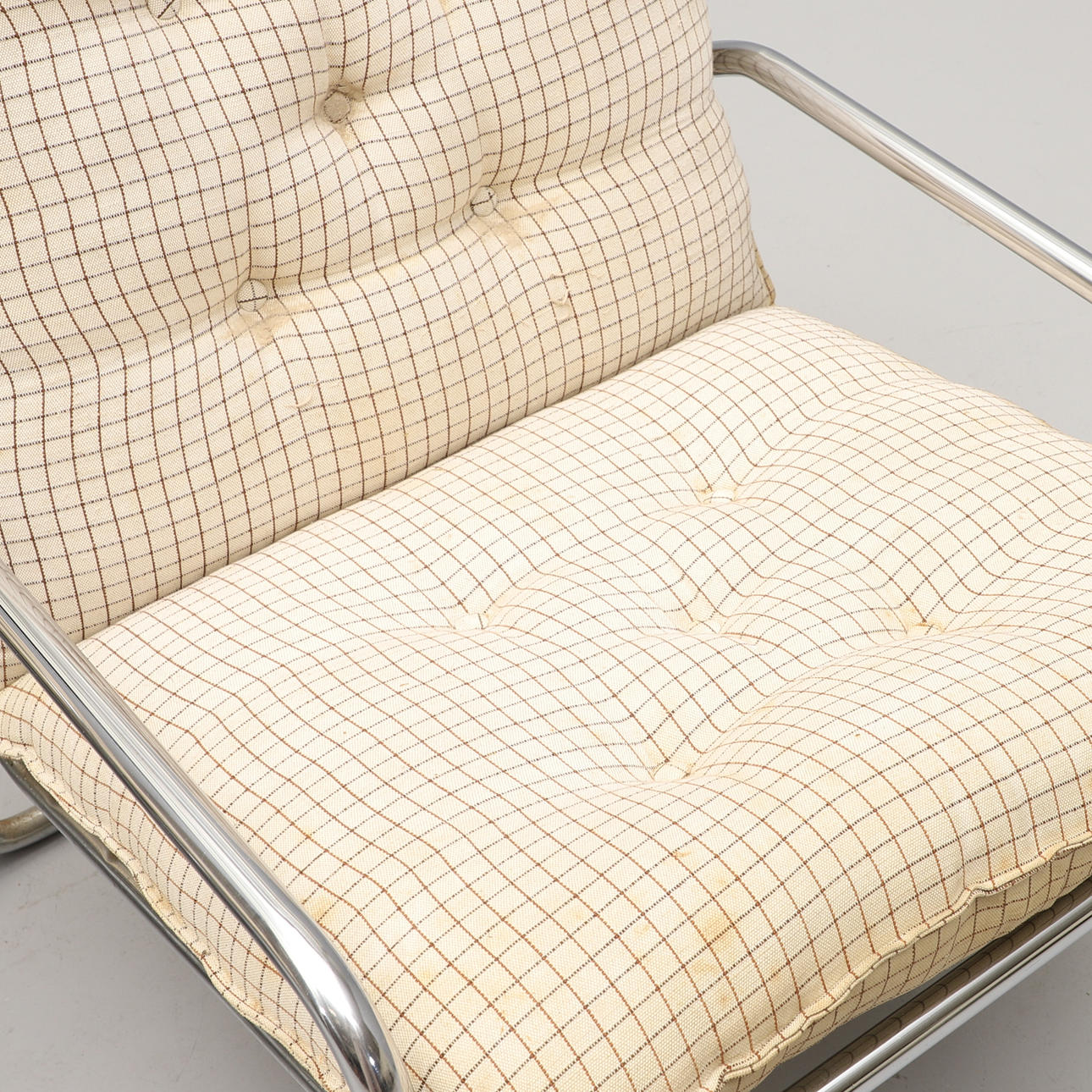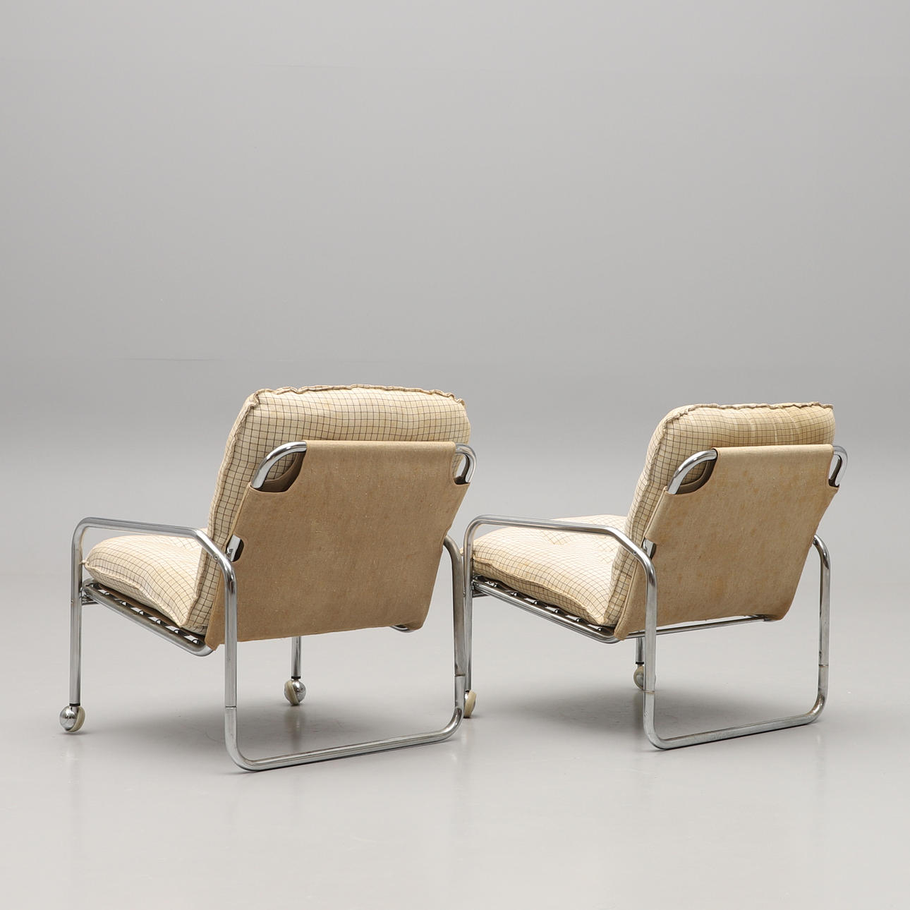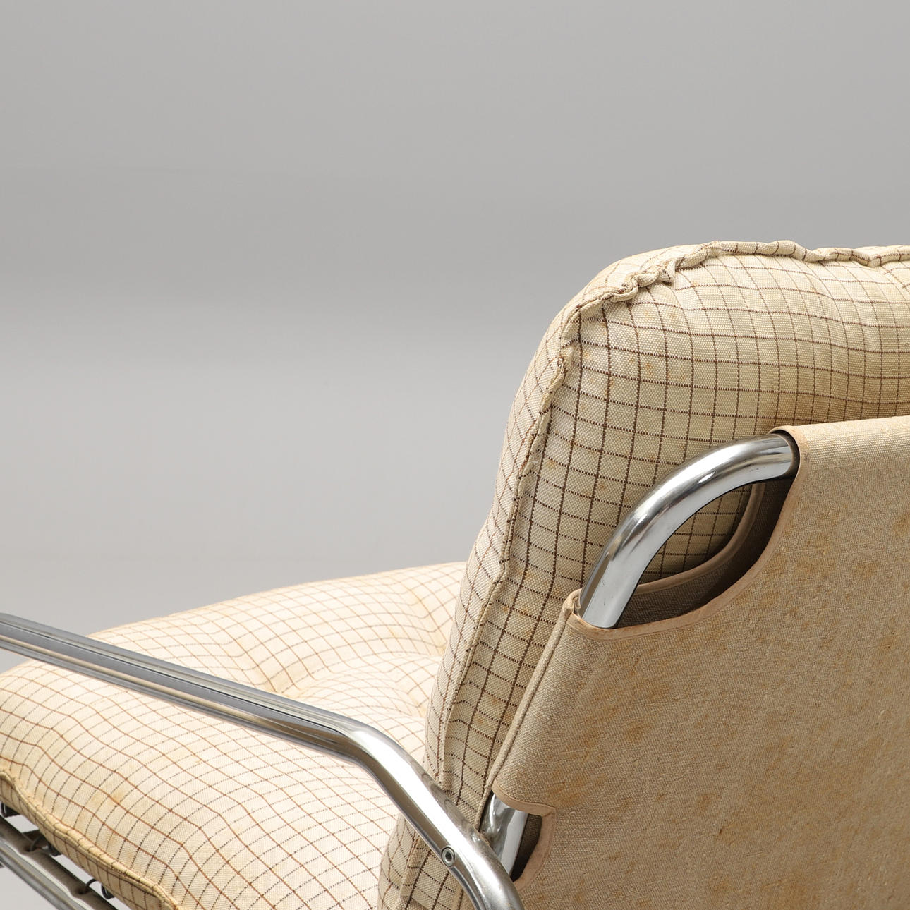 Stomme av kromad metall med hjul framtill, kanvas. Lös stoppad dyna. Sitthöjd 48, rygghöjd 78, bredd 64 cm.