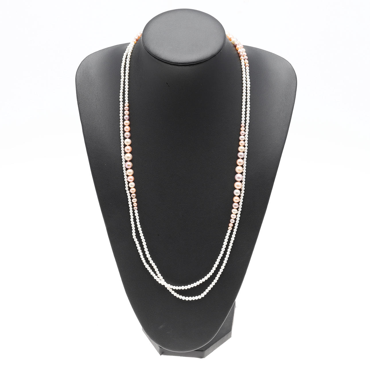 består av fyra graderade rosa silverpärlor, mellanliggande med små vita pärlor, 138cm totalt.