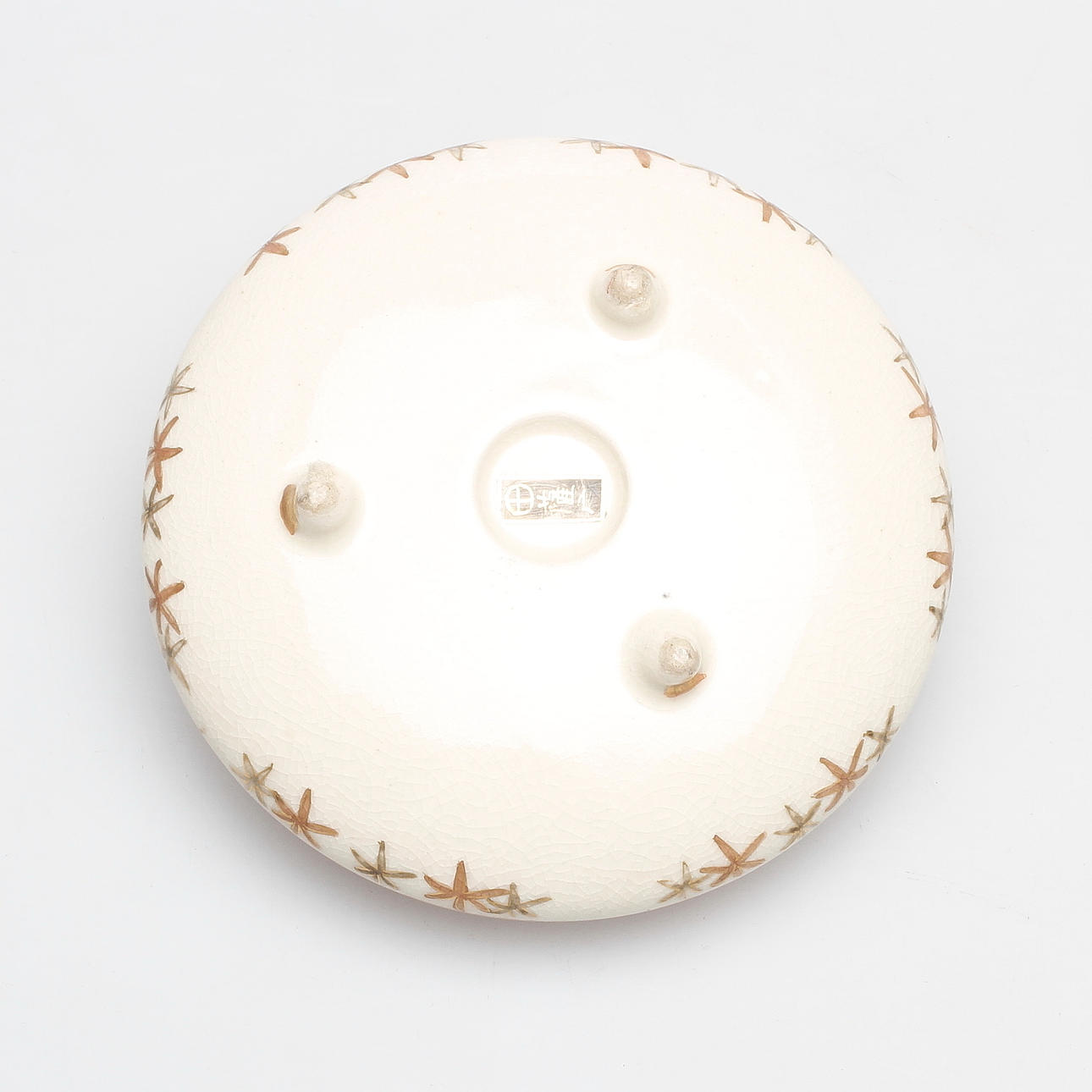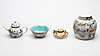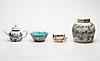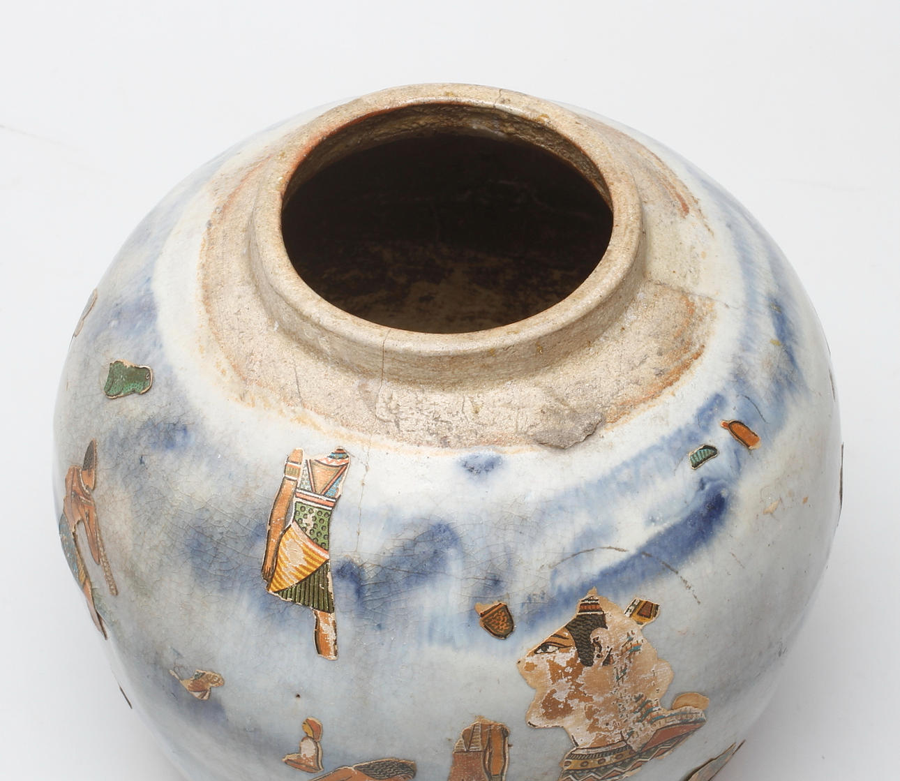 Slitage, krackelyr. Bojan med nagg och sprickor. Kanna med tuppar, defekt och lagningar.