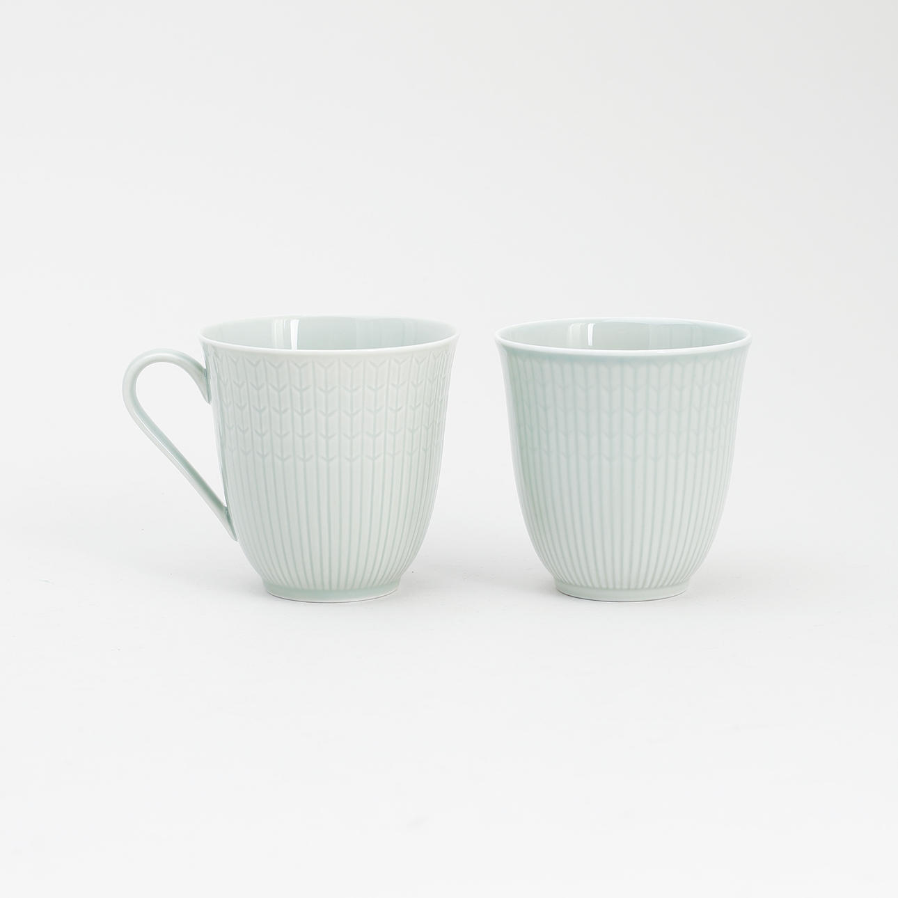 14 djupa tallrikar, 14 skålar, 2 större skålar, 6 koppar med öra, 4 koppar.
