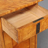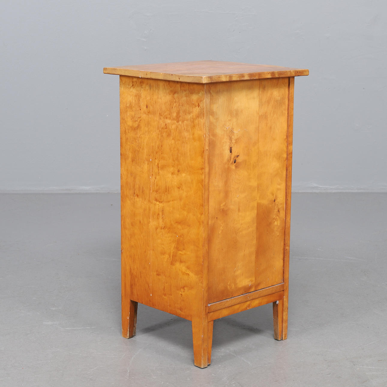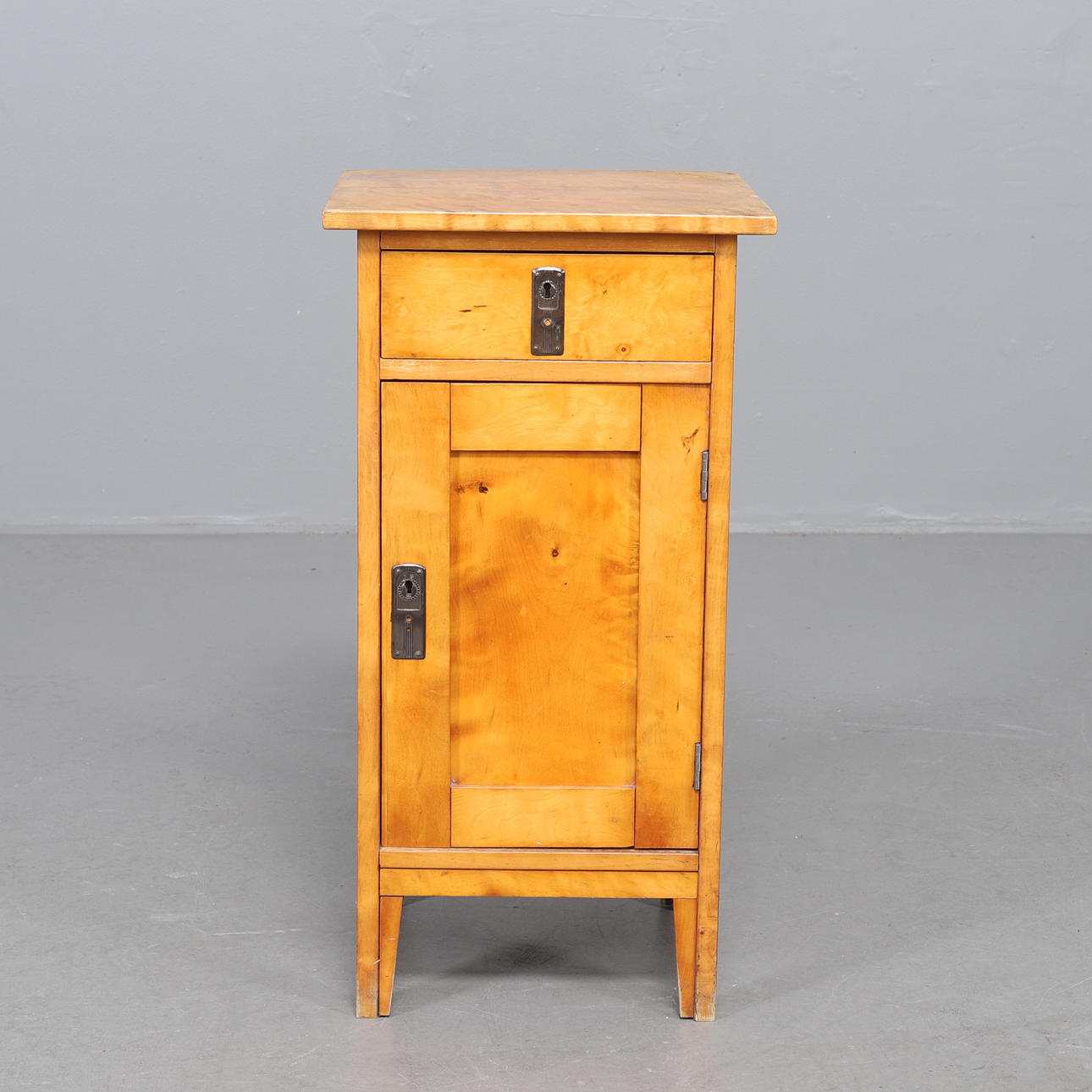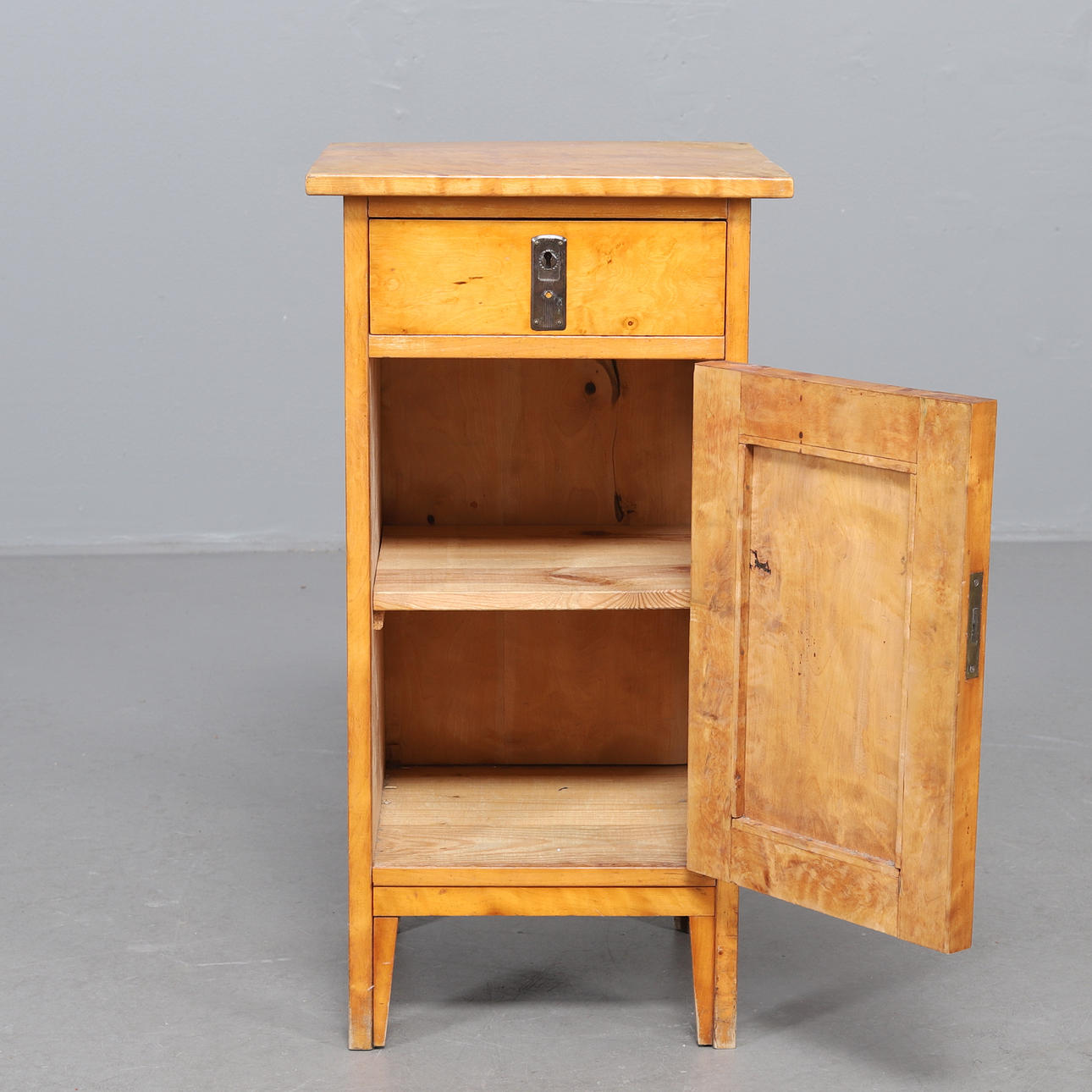 Liter skåp i björkfanér, med beslag i antikpatinerad metall. En utdragslåda och skåp. Mått: bredd 40, djup, 39, höjd 77 cm.
