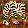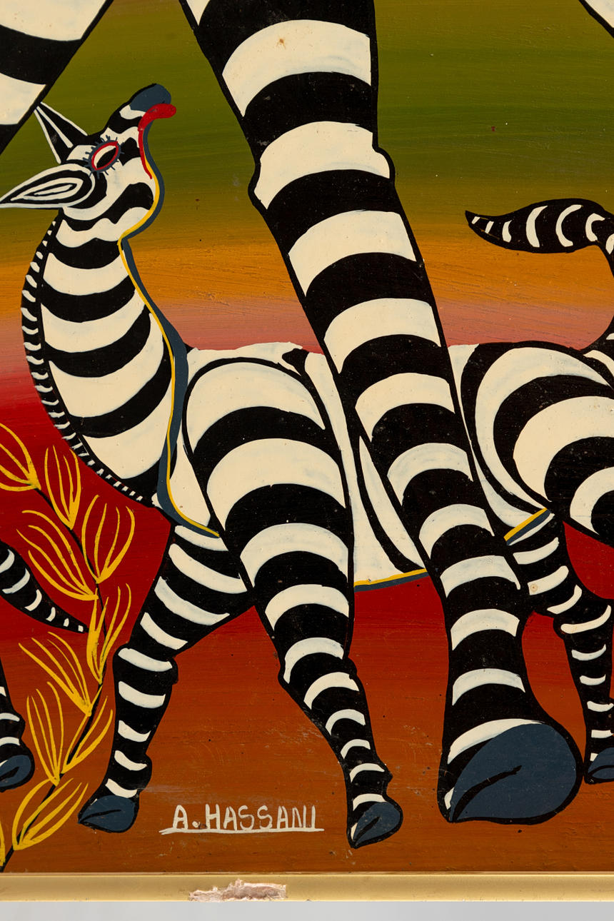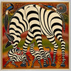 A. Hassani, Zebror - Tinga Tinga, blandteknik med lack och olja på masonit, signerad i botten mitten, inskriven ”No 11" på baksidan, ca. 60 x 60 cm, med ramremsa ca. 61,5 x 61,4 cm