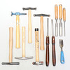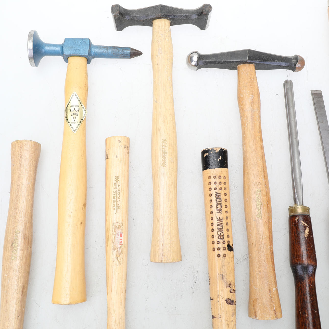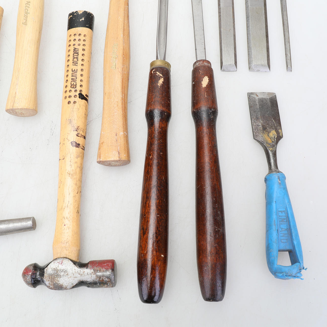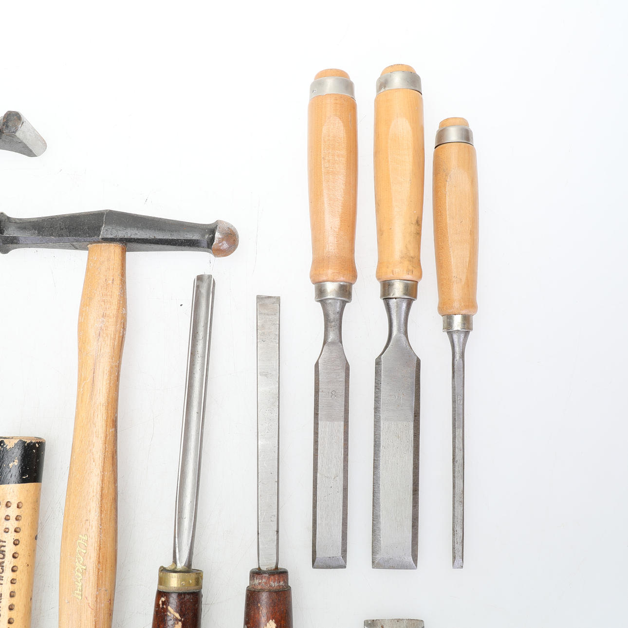 Hammare i fint skick, flera av dem sparsamt använda. Svarvstål och stämjärn i bruksskick.