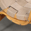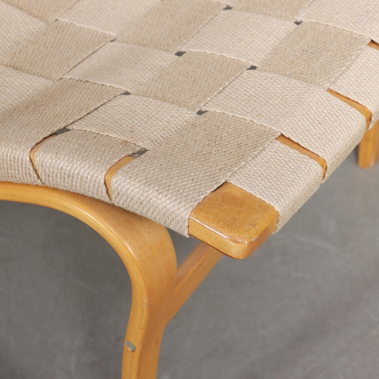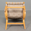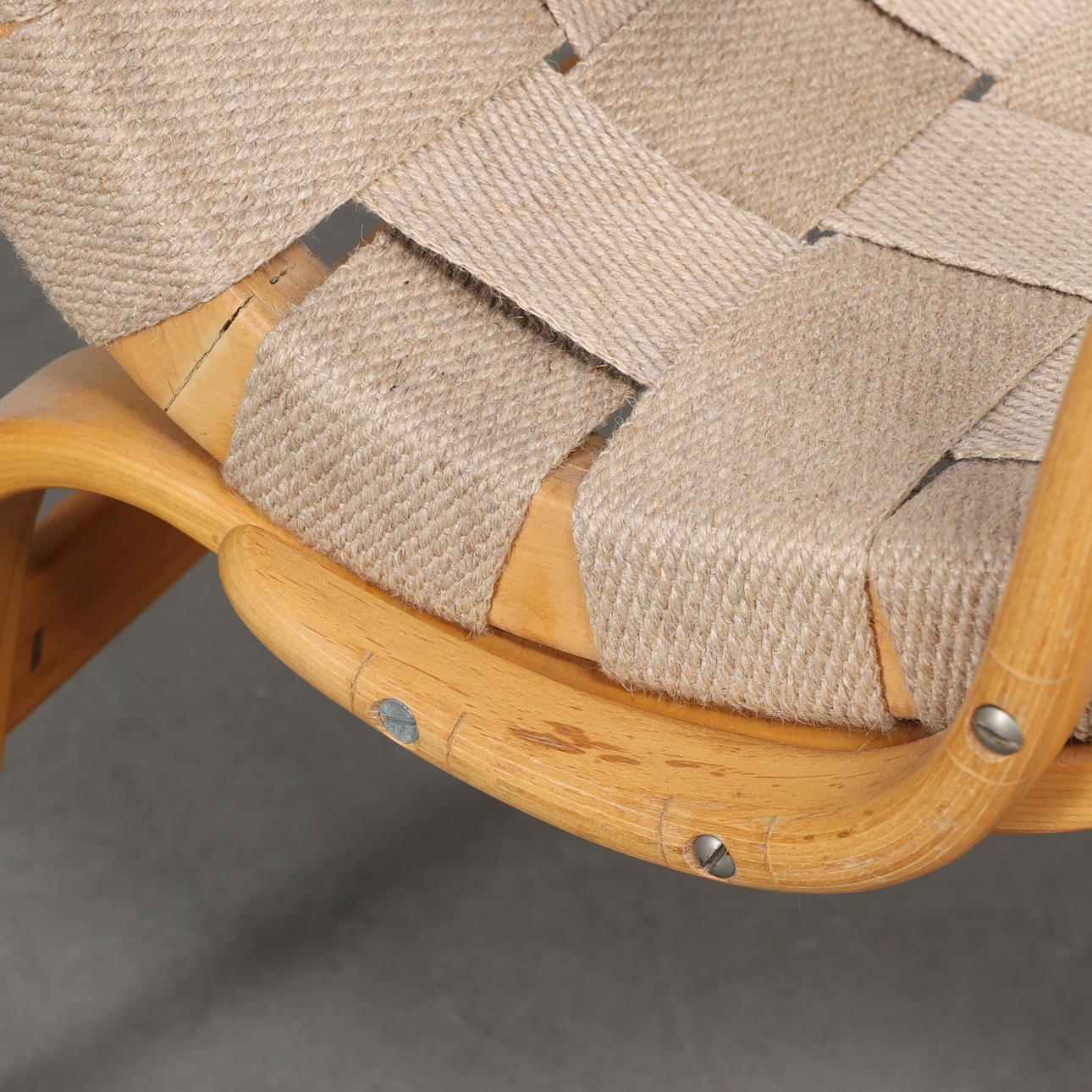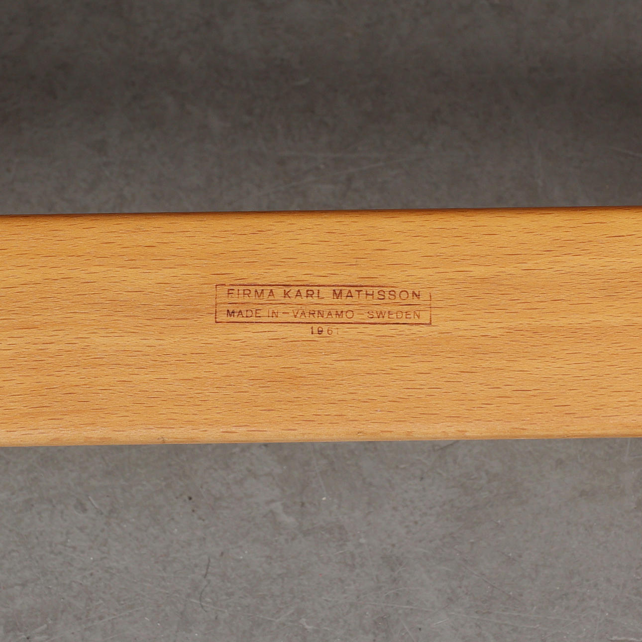 Karmstol modell Eva formgiven av Bruno Mathsson1941 och tillverkad av Firma Karl Mathsson, Värnamo. Brännstämplad och daterad 1961. Böjträstomme i bok, säte i flätad linnegjord.