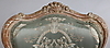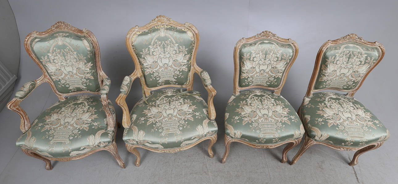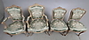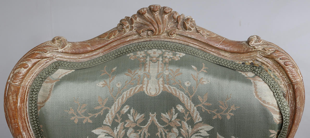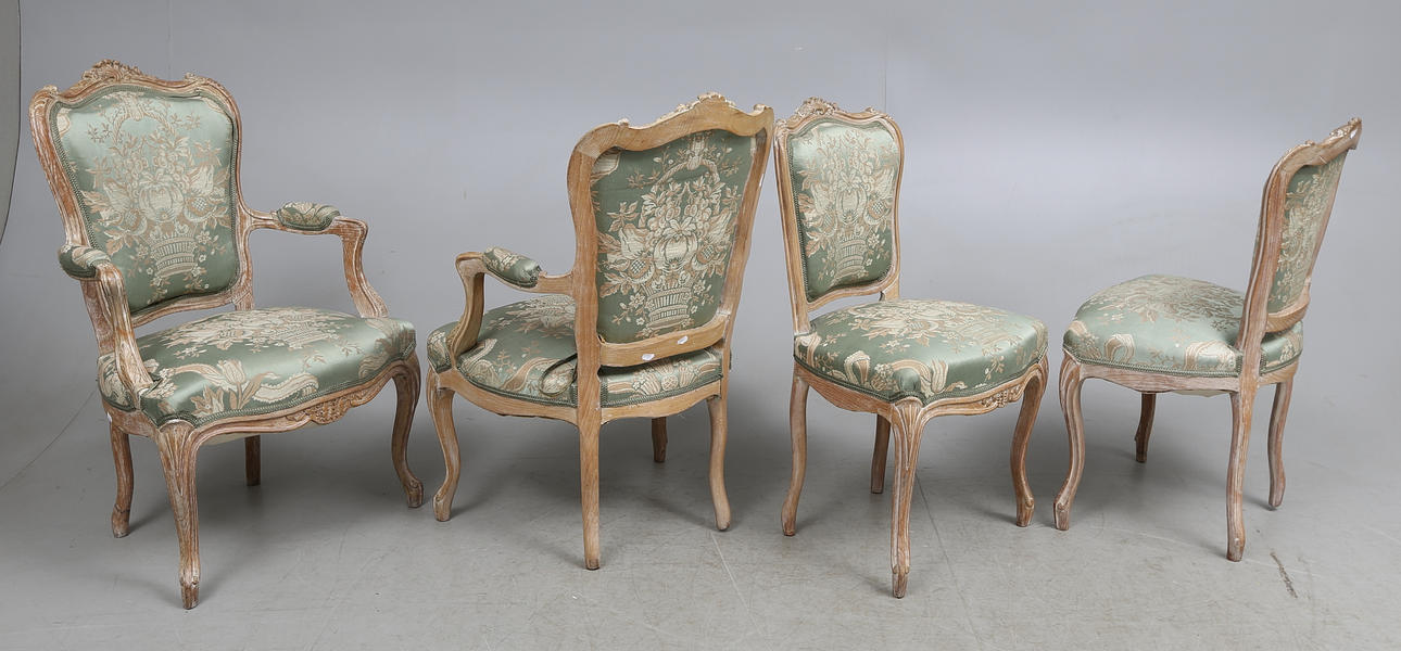 Bruksslitage. Soffa med mindre fläckar. En stol med lösa band och några spikar saknas. Torkad stoppning.