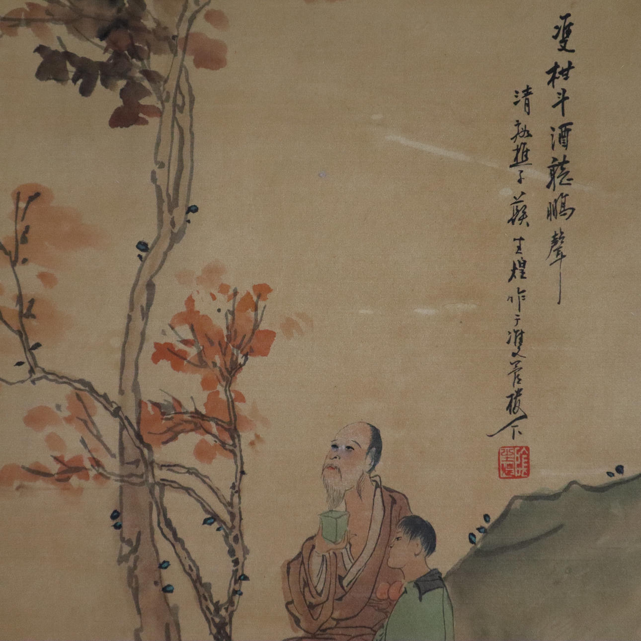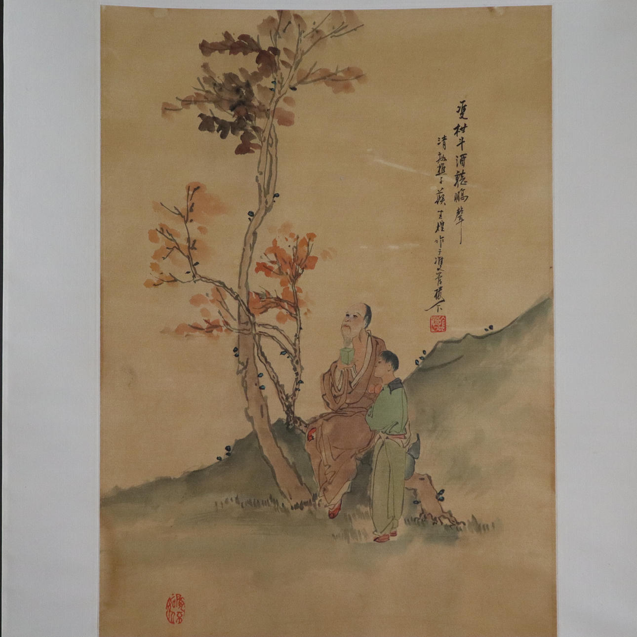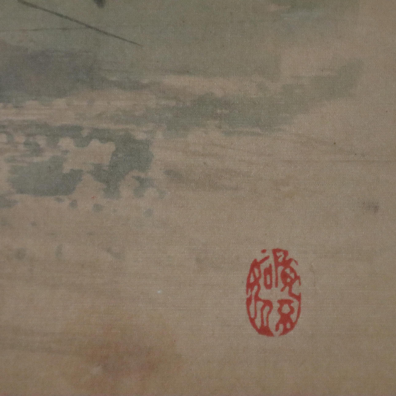 Bläck och ljusa färger på sidentyg, inskriven och förseglad i kinesisk kalligrafi, ca 50 x 33,5 cm/ca 49 x 33,5 cm, monterad som rullmålning på fastare papper med sidenväv montering på framsidan, viktad med stav.