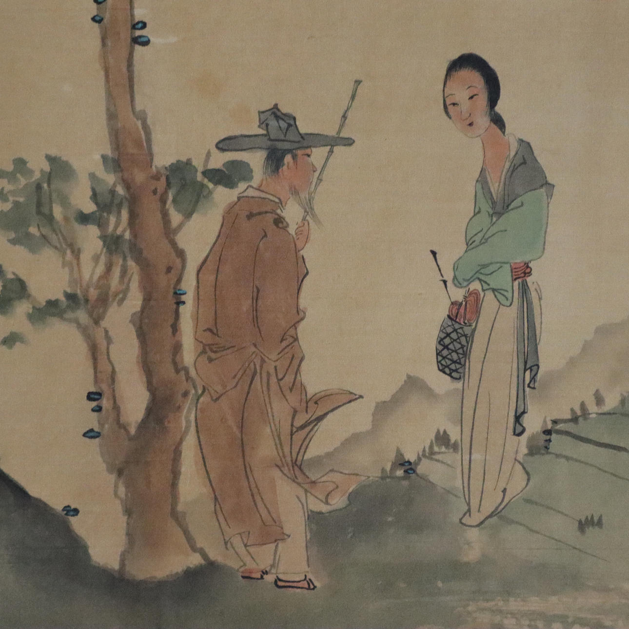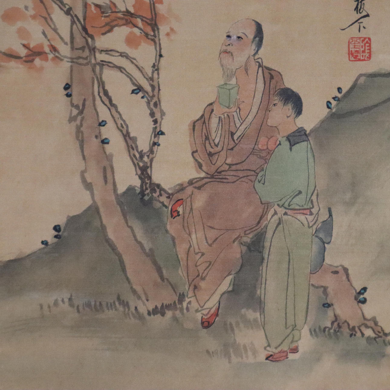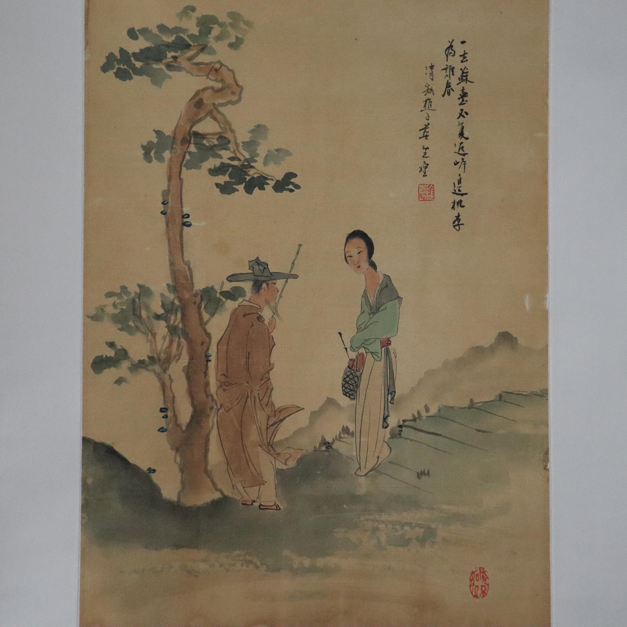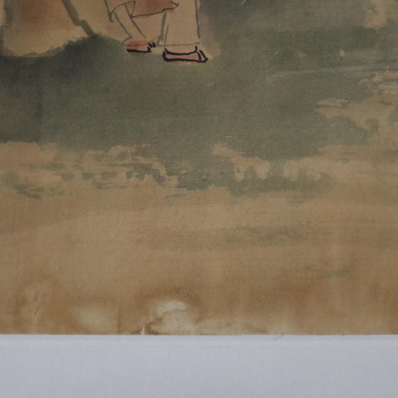 Bläck och ljusa färger på sidentyg, inskriven och förseglad i kinesisk kalligrafi, ca 50 x 33,5 cm/ca 49 x 33,5 cm, monterad som rullmålning på fastare papper med sidenväv montering på framsidan, viktad med stav.