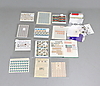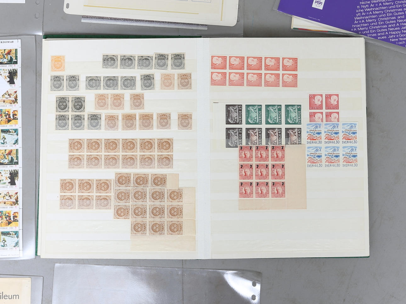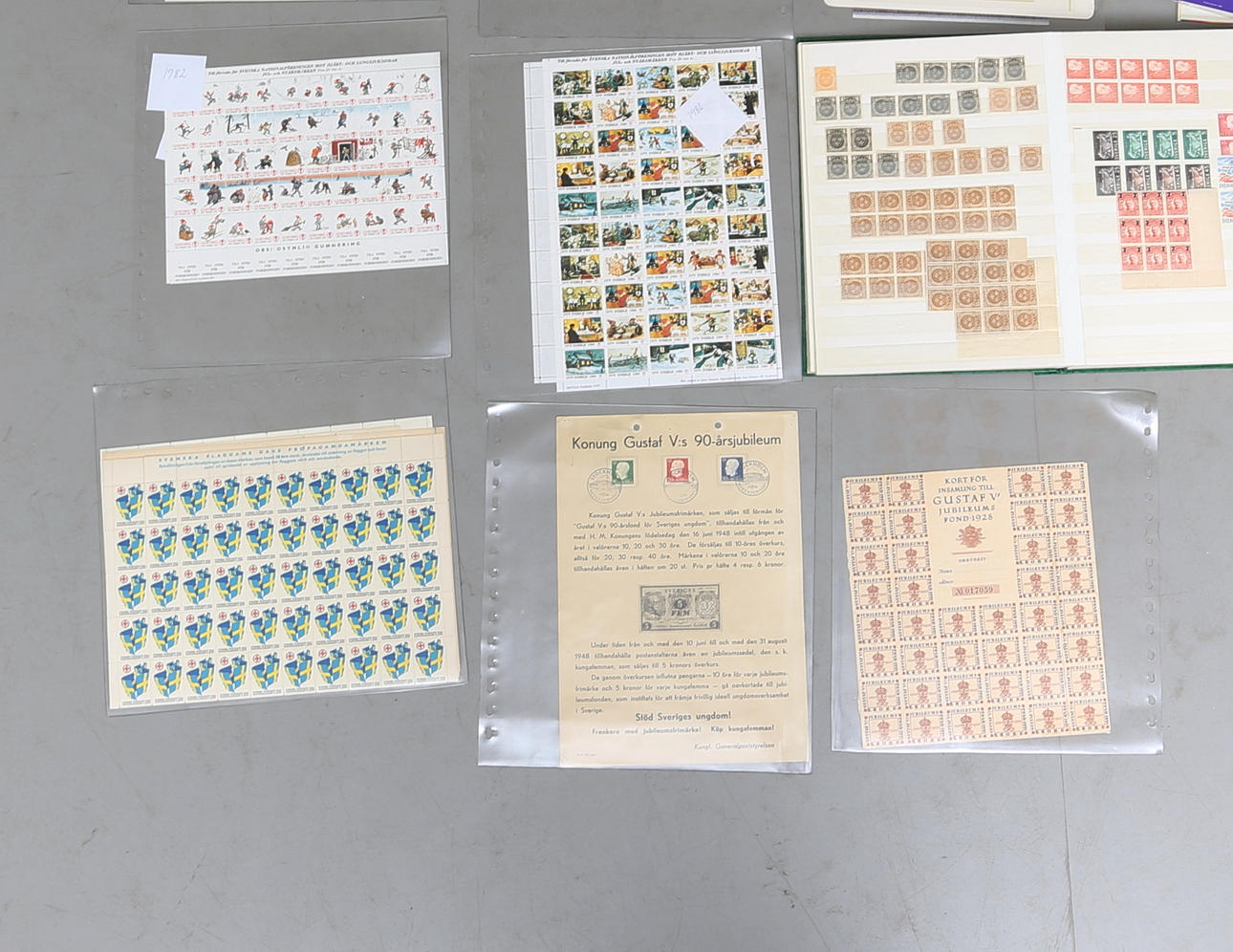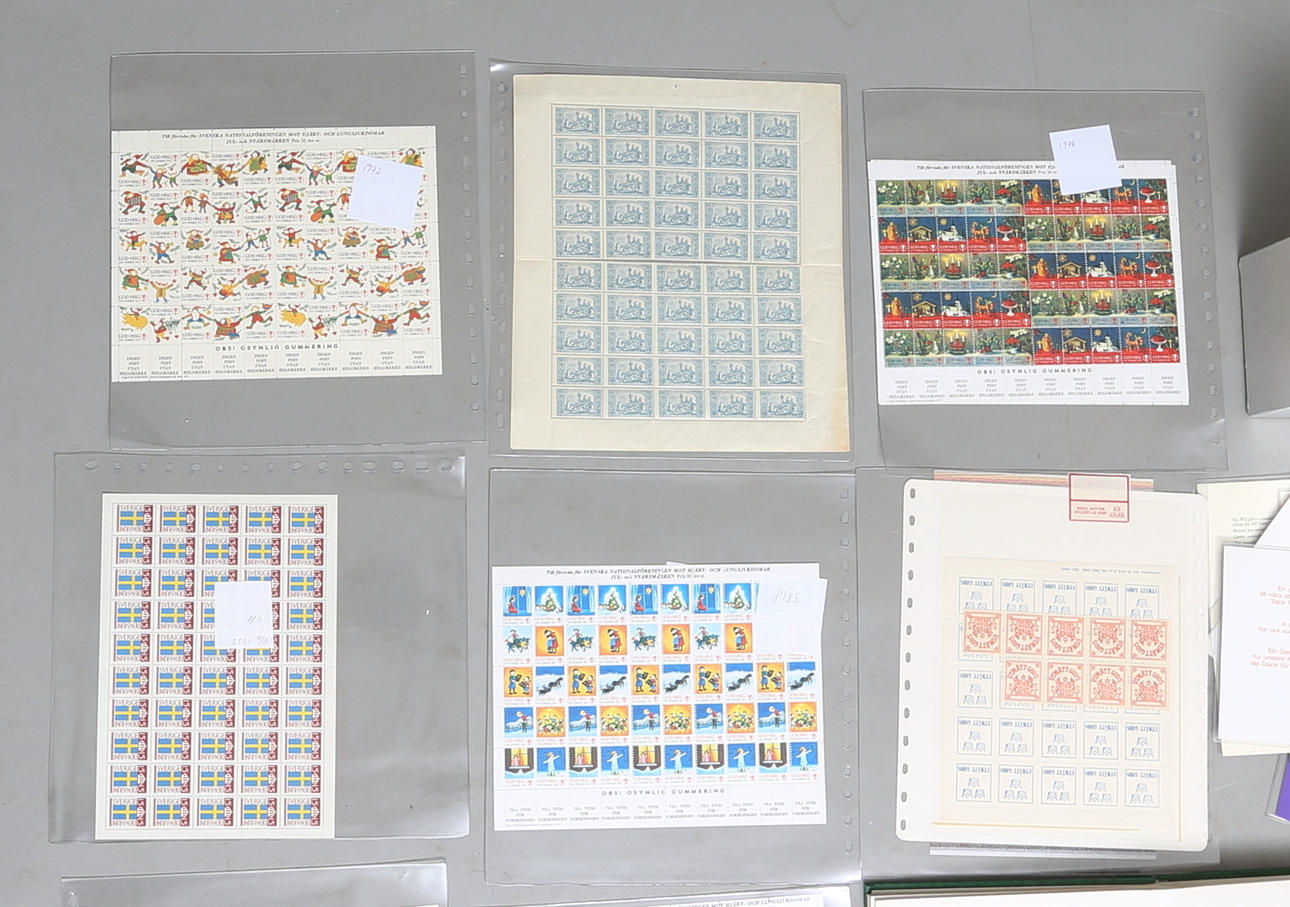 Postfriska frimärken, provhäften, god-helg-frimärken, utmätt-gods-frimärken, välgörenhetsfrimärken med mera, i flertalet ark.