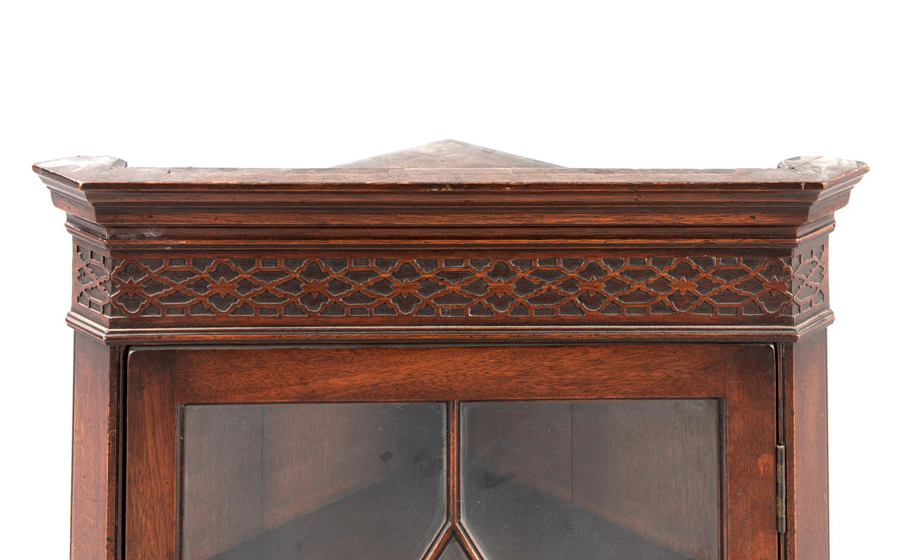 mahogny Profilerad ram och pediment. Tresidig kropp med en bred dörr glaserad bakom en diamantstag. Brett, spetsliknande band i gavelfältet. HxLeg längd: ca. 65 x 38 cm.