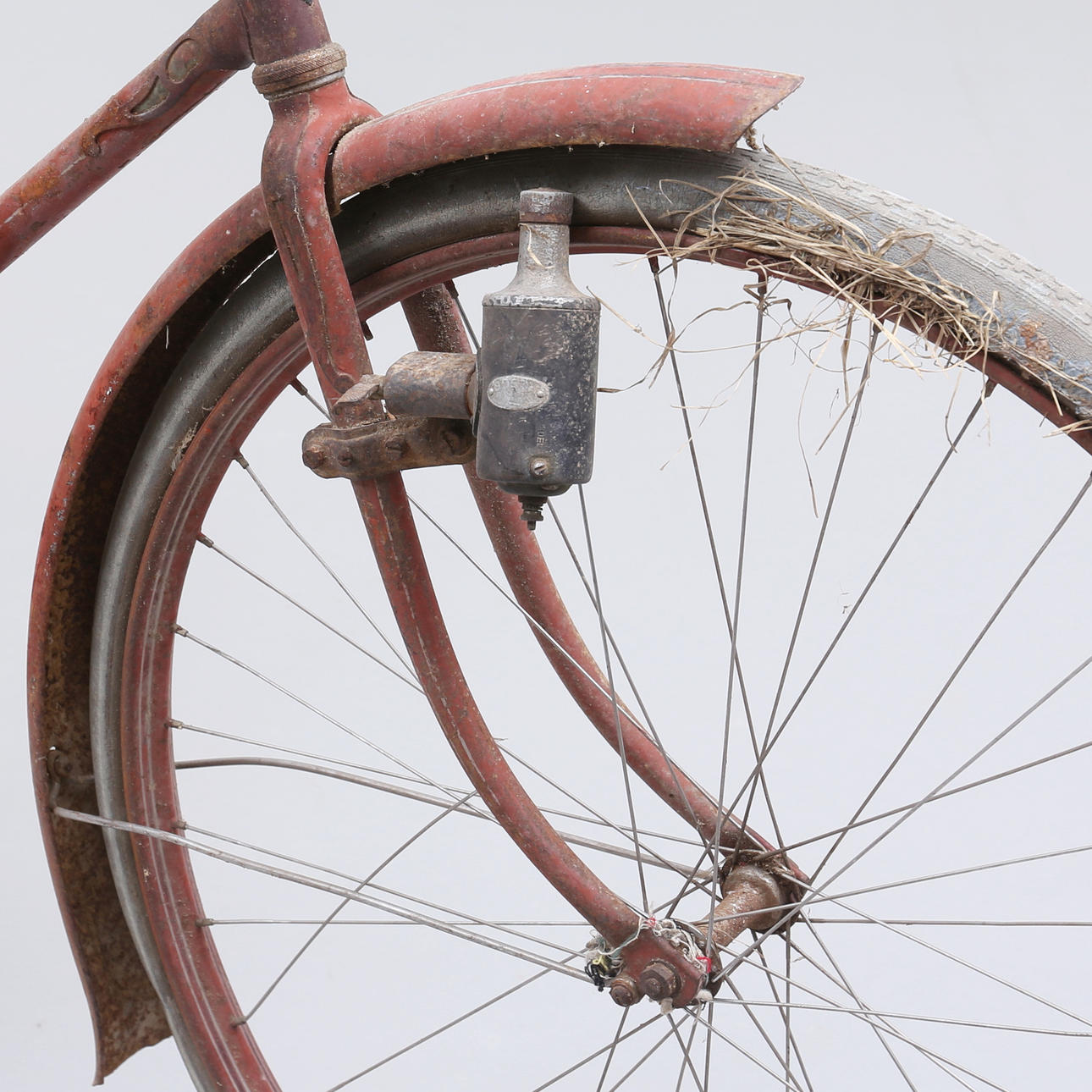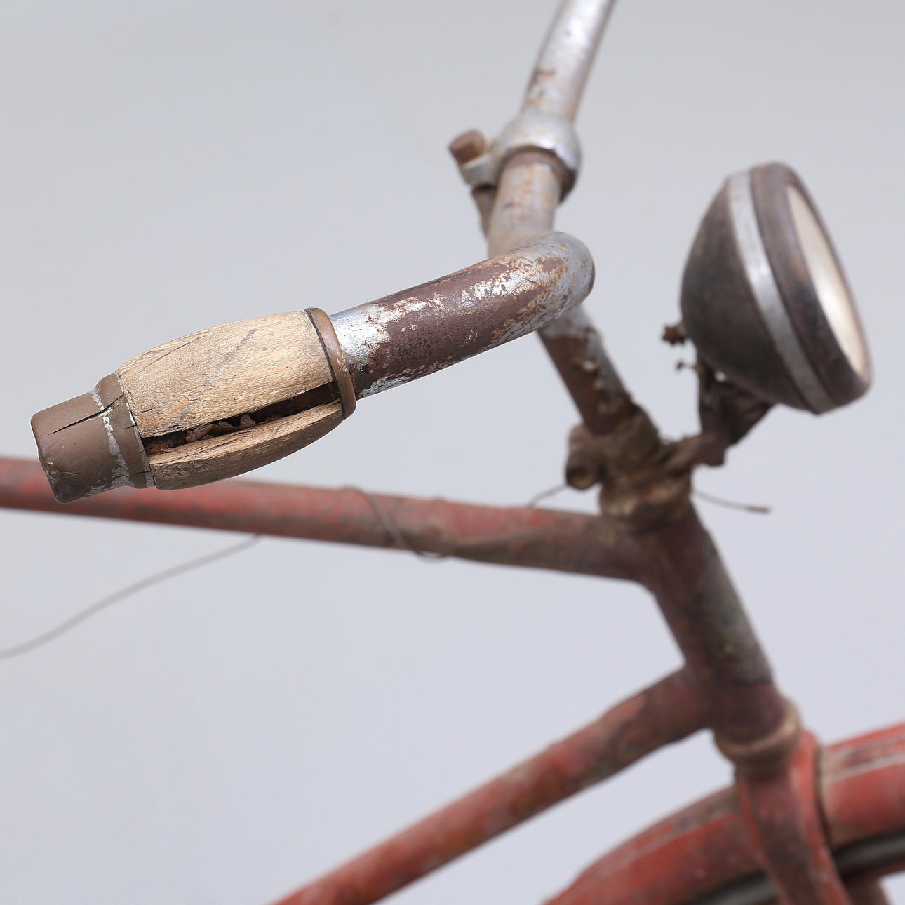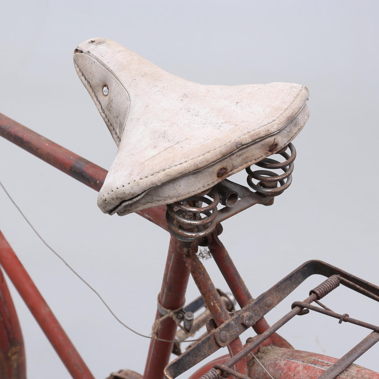 Grovt slitage, skador. Rostanlupen, färgbortfall. Trasiga däck samt sadel.