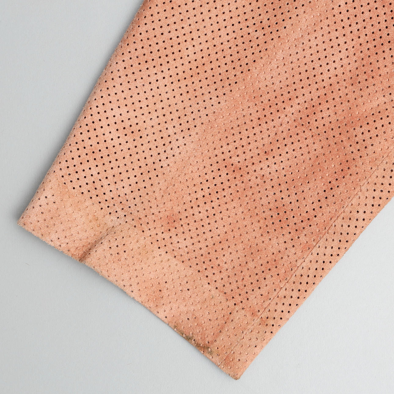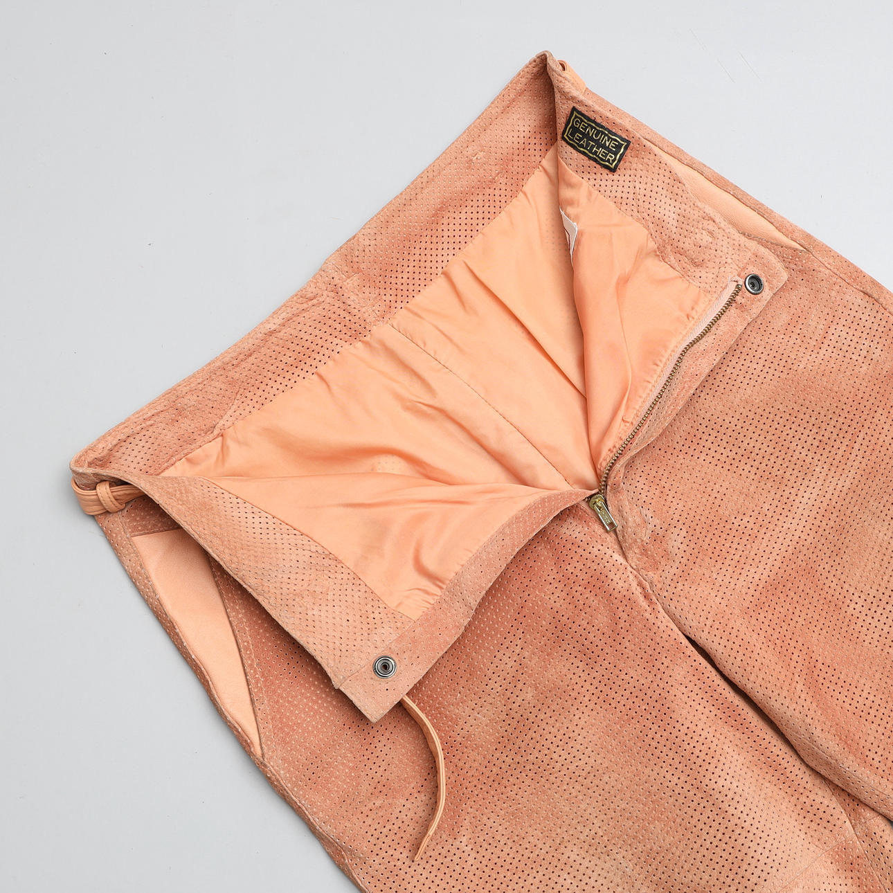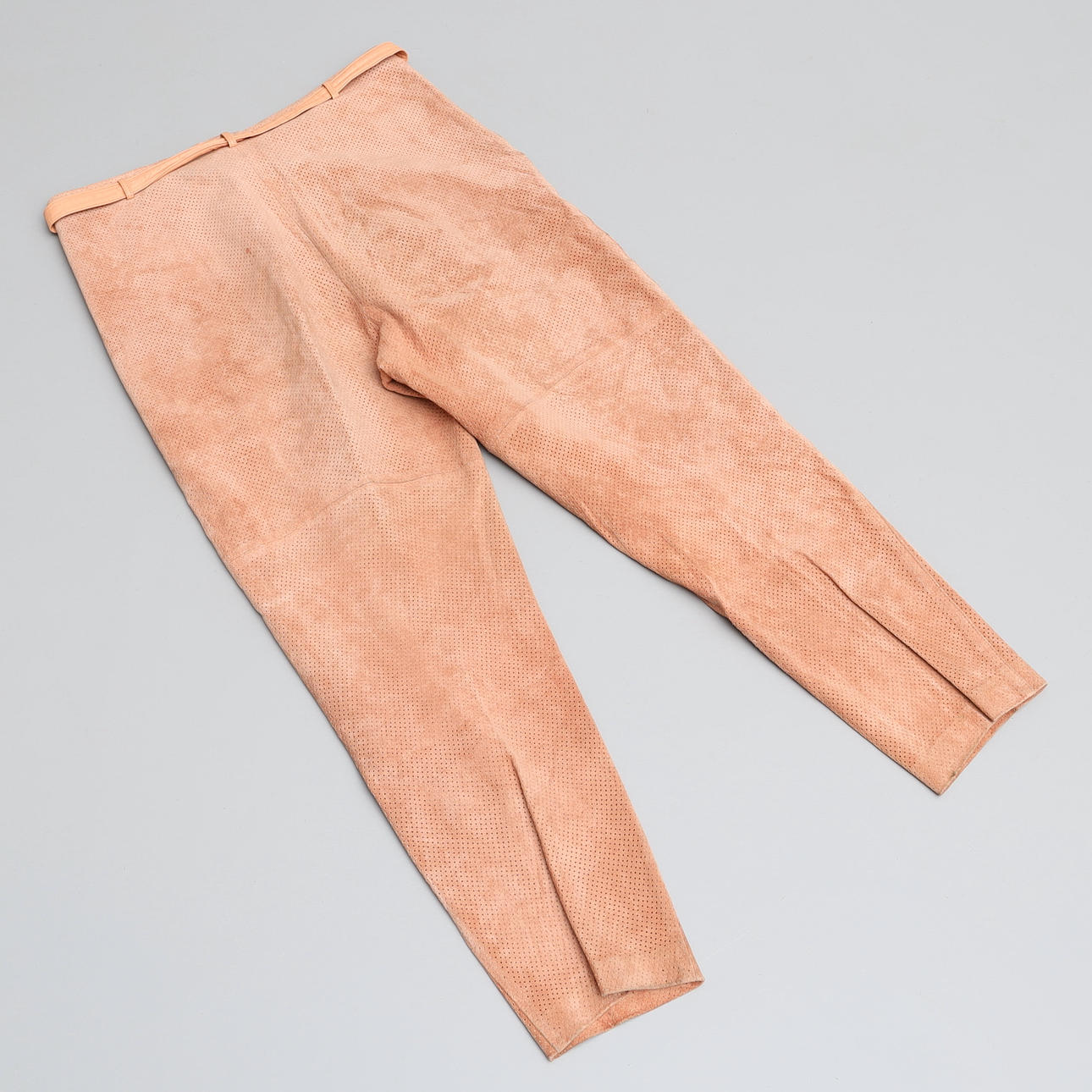 Med bälte och två fickor framtill. Nötnappa / svinmocka. Foder 100% nylon. Made in S. Korea. Beninnerlängd ca 66 cm, midjemått ca 84 cm.