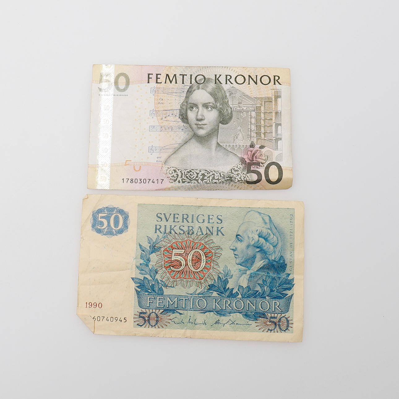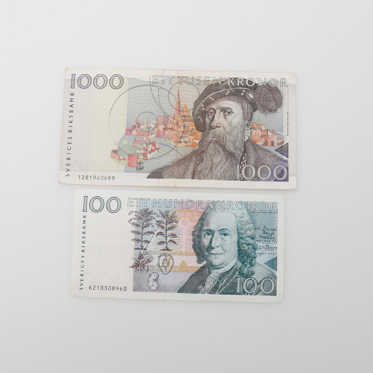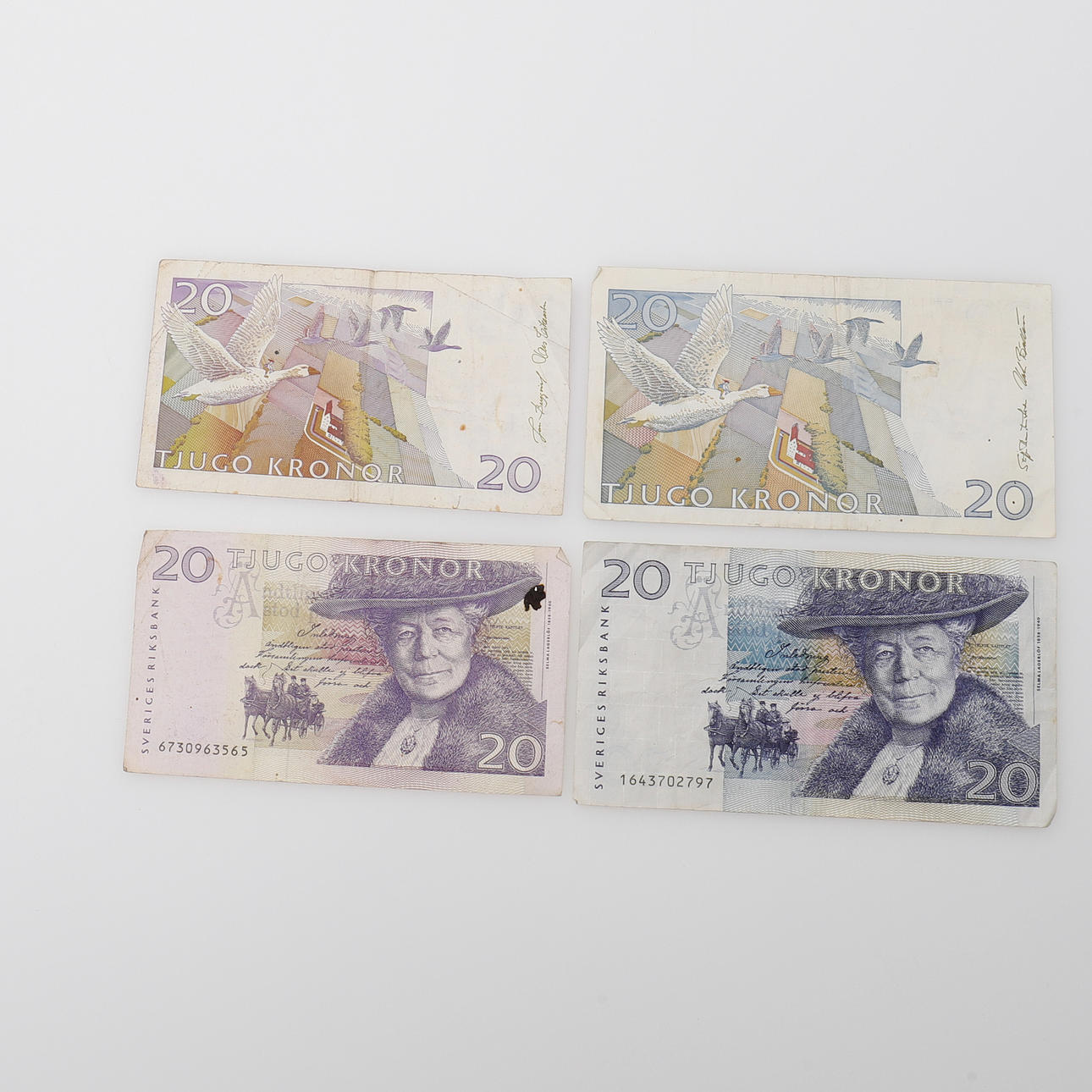 7x 1kr (den så kallade kotian), 174x 5kr; 283x 10kr; 17x 20kr; 8x 50kr; 18x100kr; 1x 1000 kr. Nominellt värde 7247 kr.