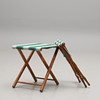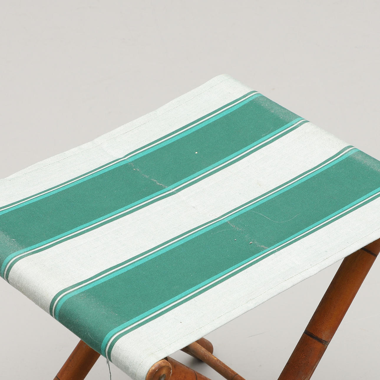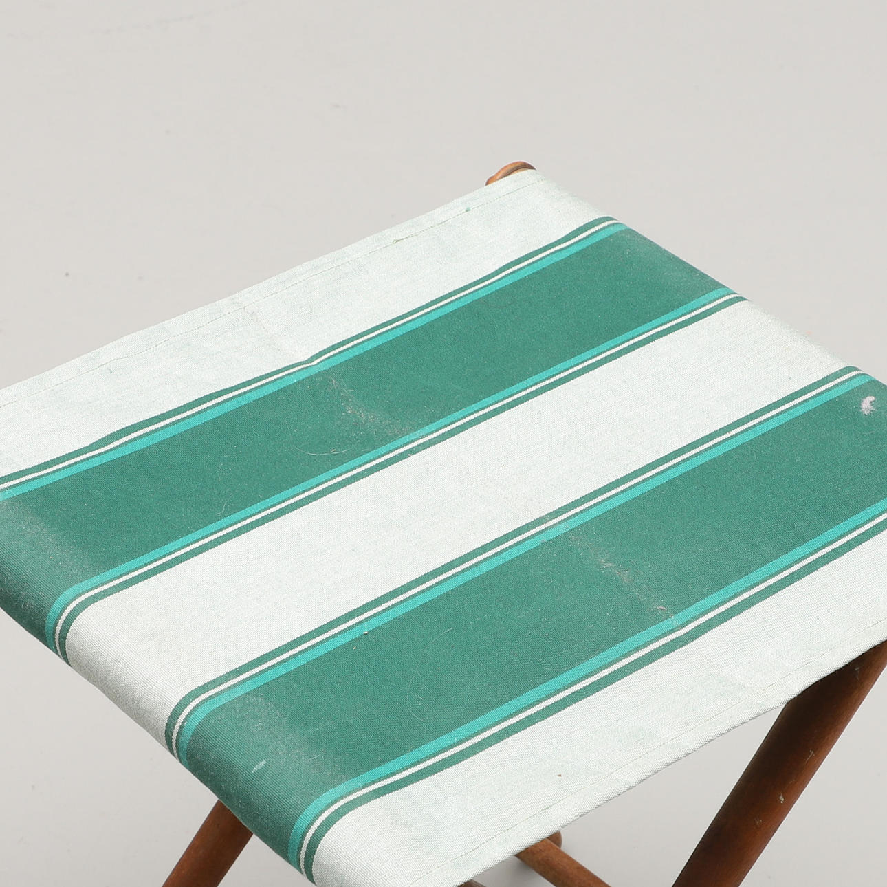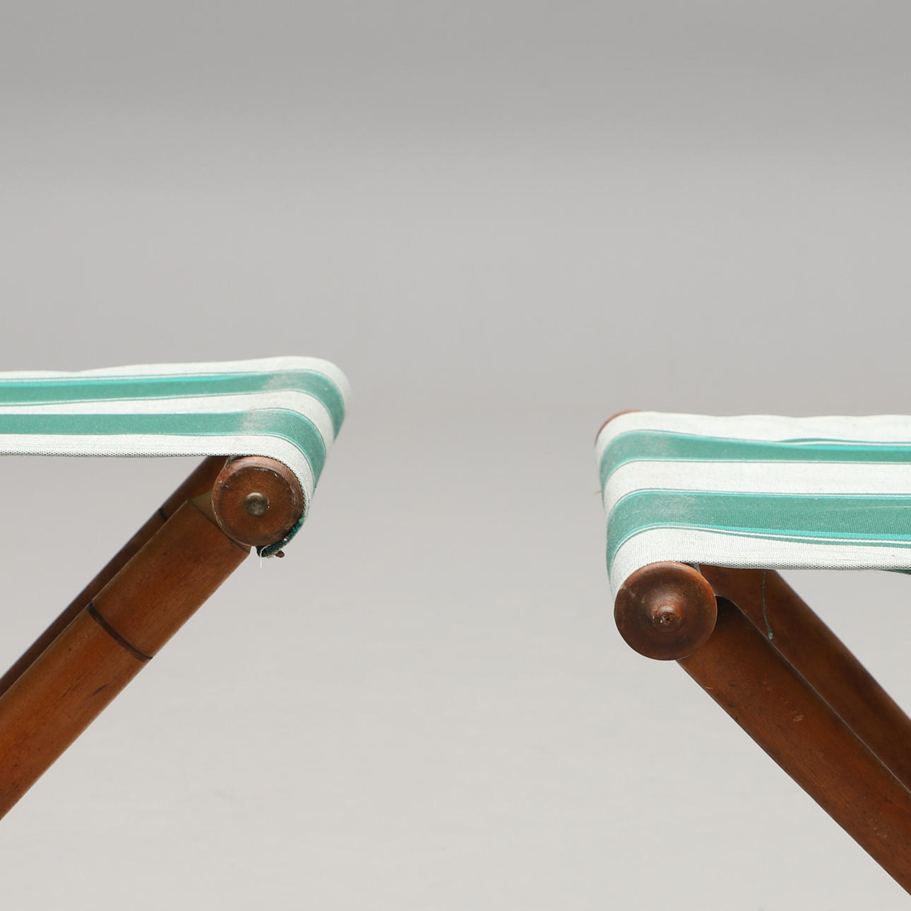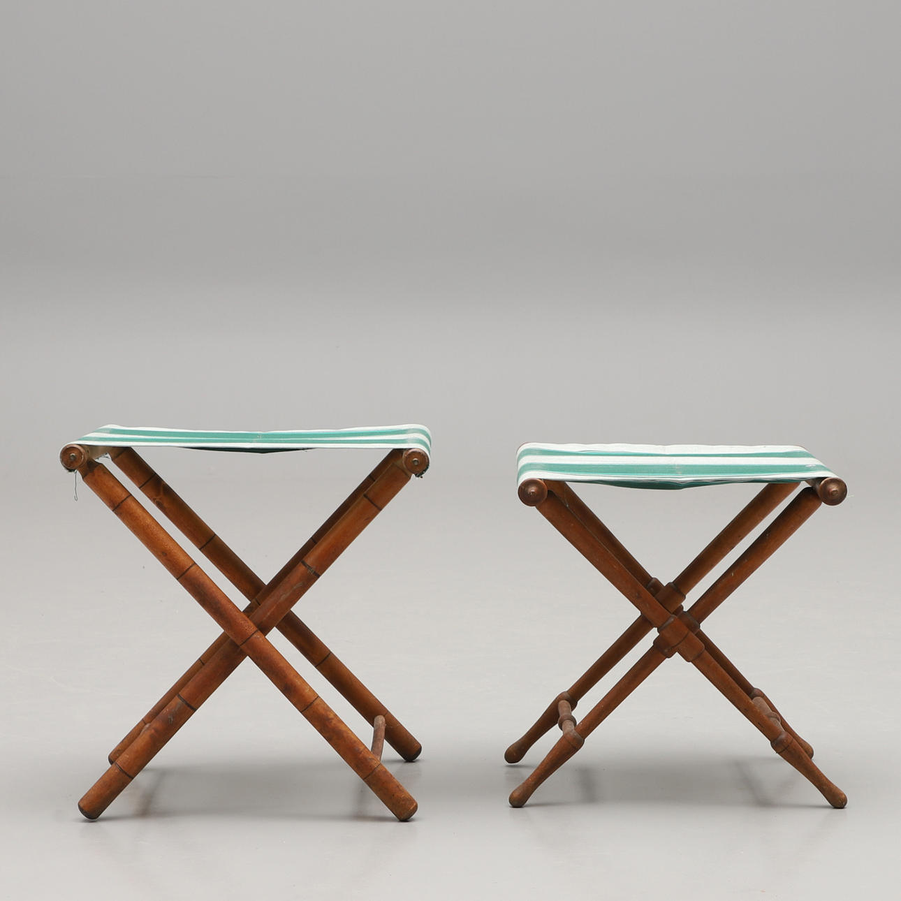 Trä och textil. Hopfällbara. Sitthöjd c:a 43 resp 48 cm.