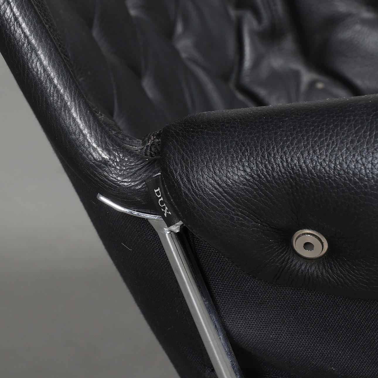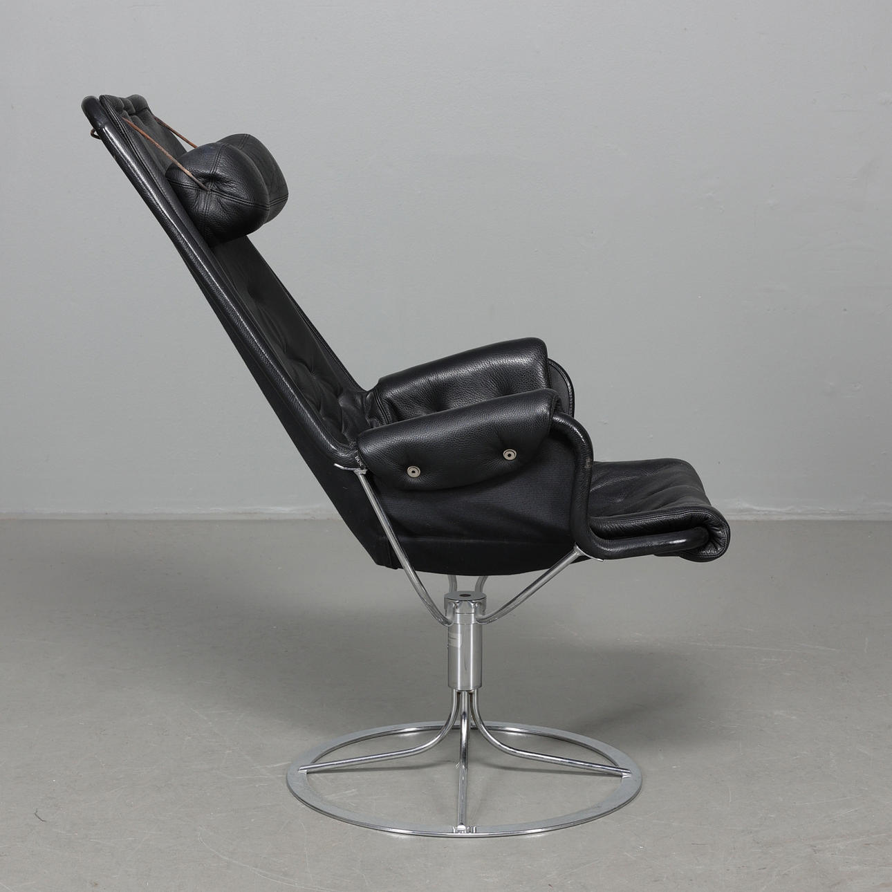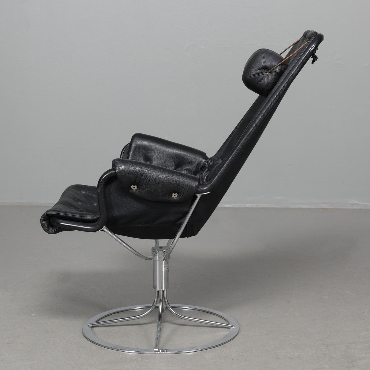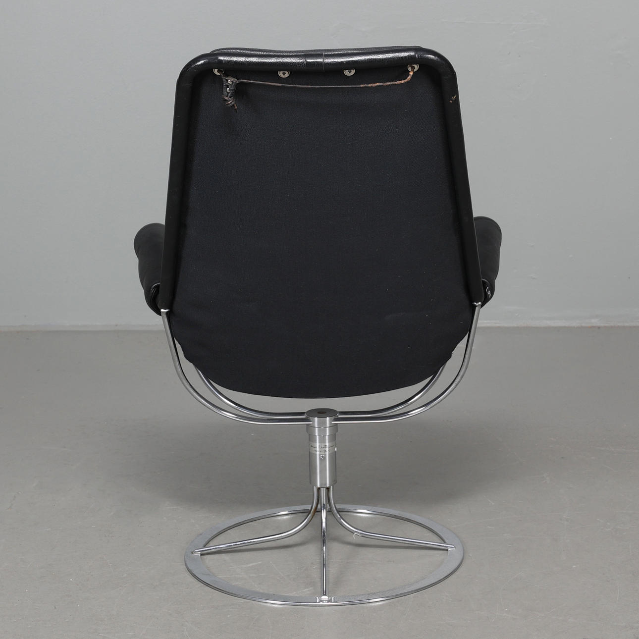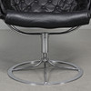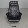 Fåtölj med stomme i kromat stål. Säte i svart textil, dyna samt nackkudde klädda i svart läder. Etikettmärkt på bas.