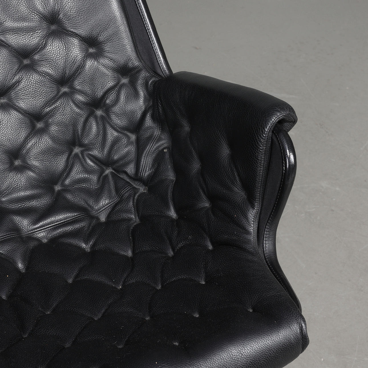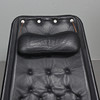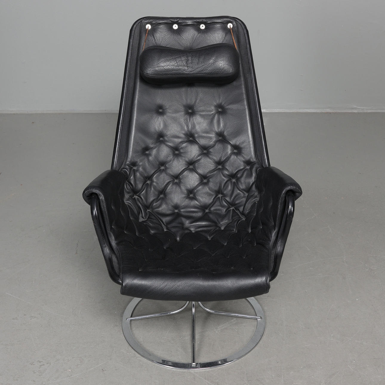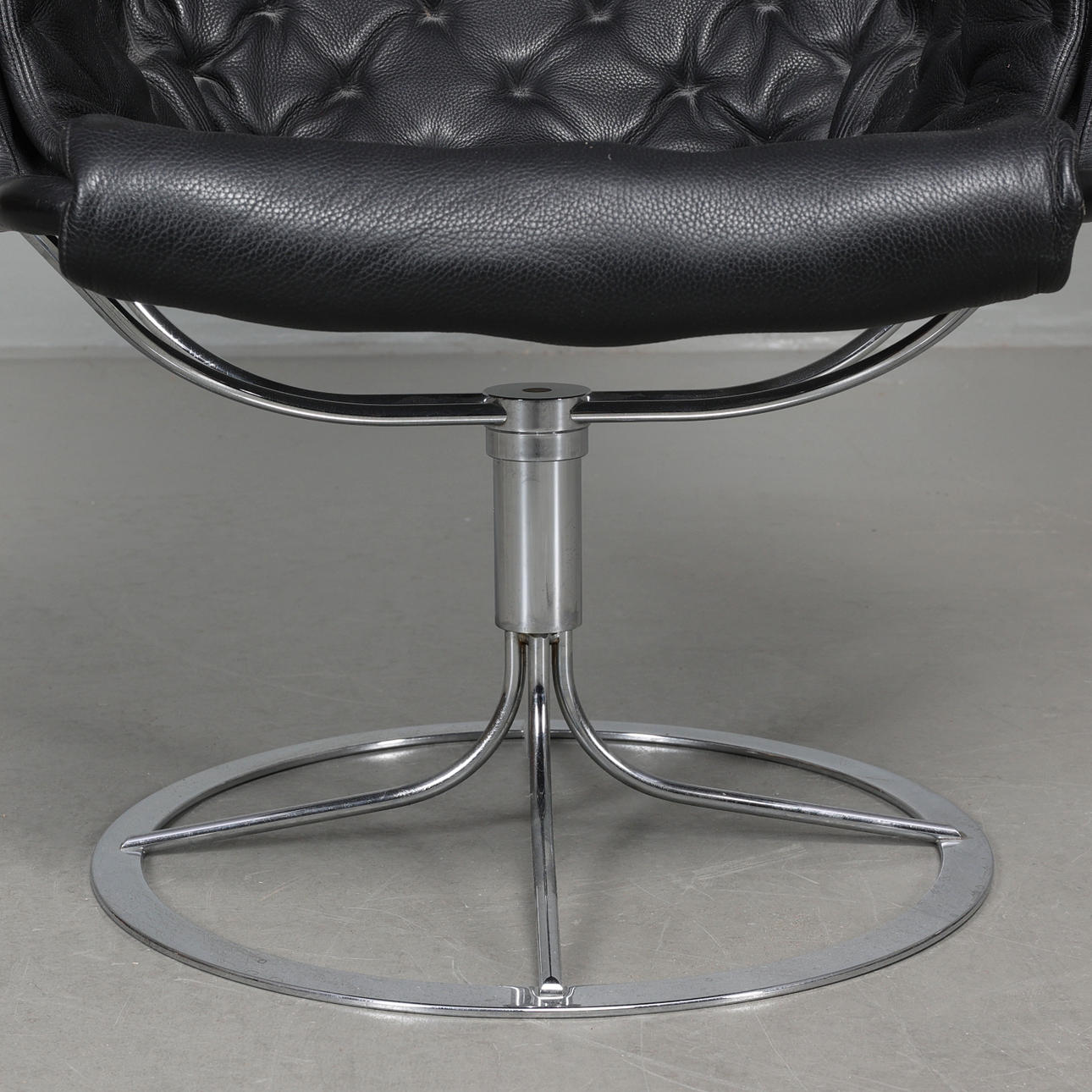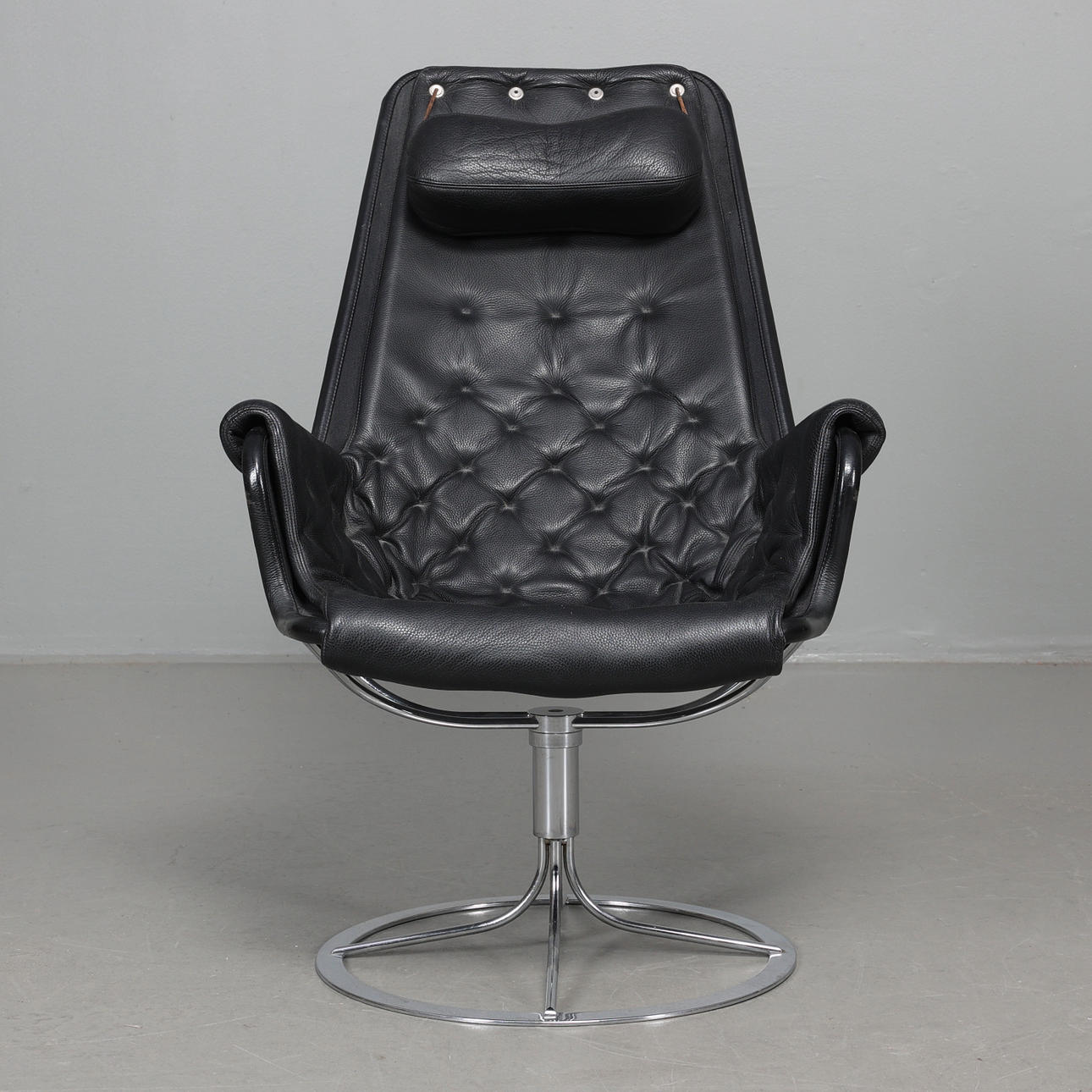 Fåtölj med stomme i kromat stål. Säte i svart textil, dyna samt nackkudde klädda i svart läder. Etikettmärkt på bas.