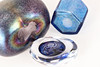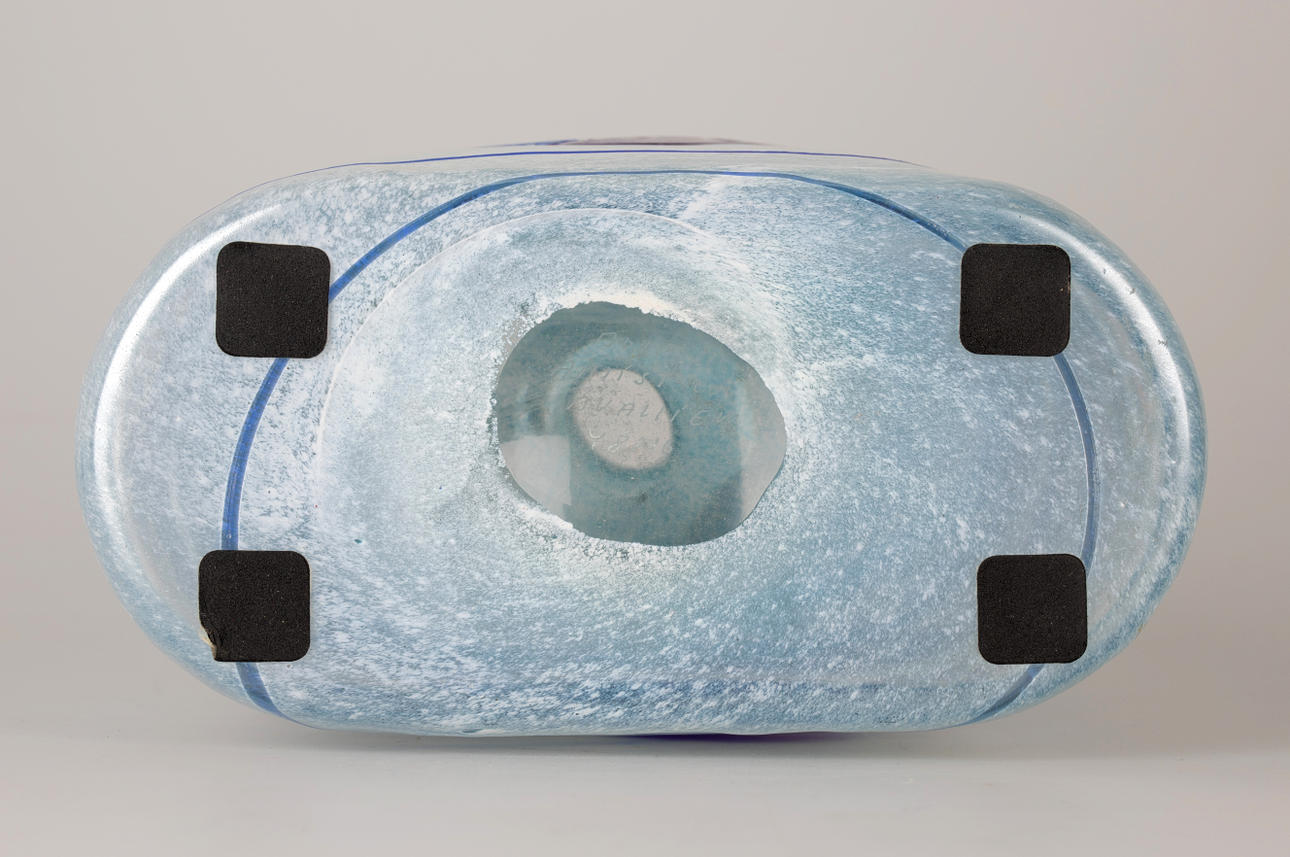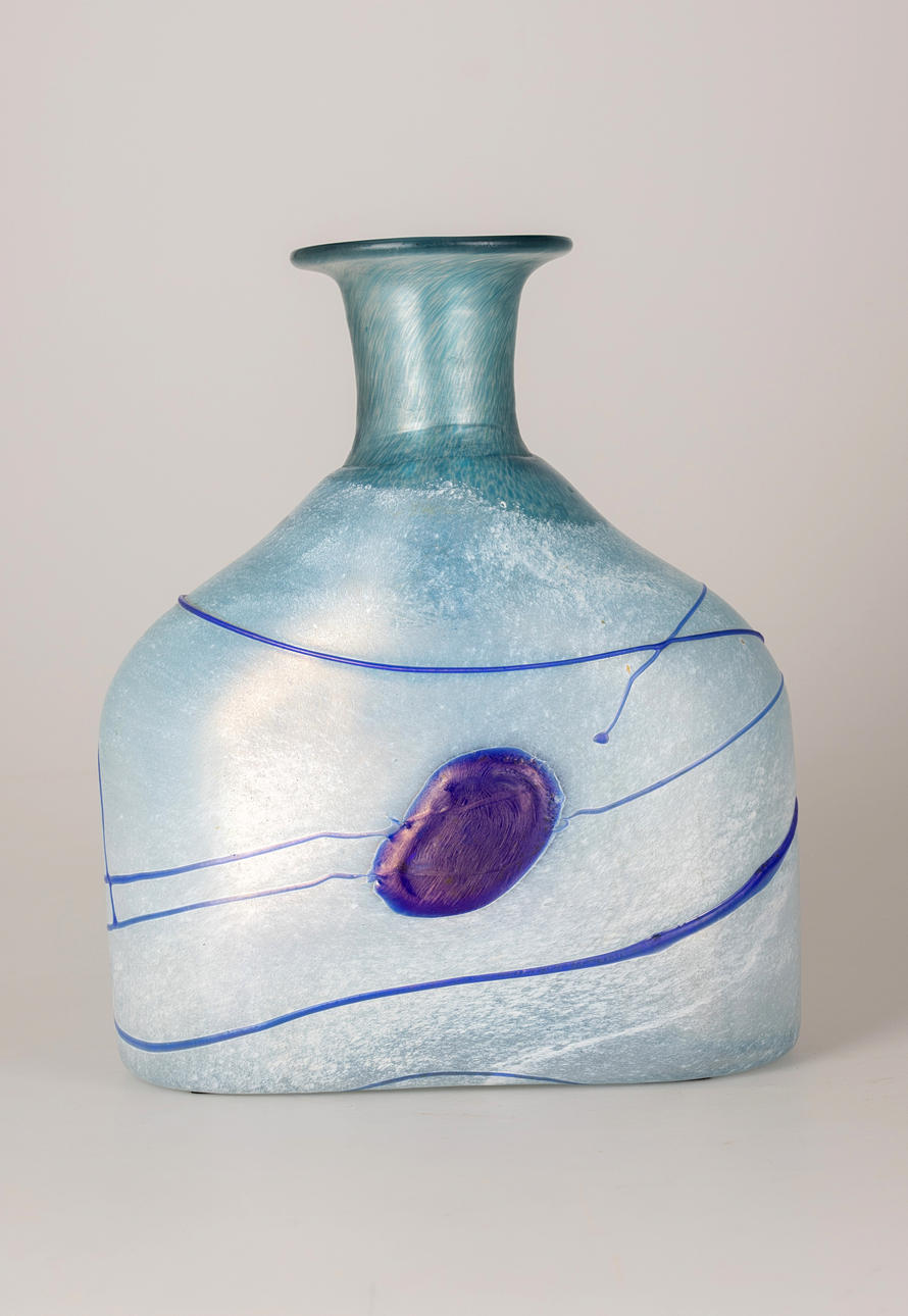 Vas, glas, ”Galaxy”, dekoration i blått på vitt och ljusblå iriserande glasmassa, smal hals med utsvängd mun. Signerad nedan ”Boda Artist Col B Vallien 48016", ca. H 27,5 cm