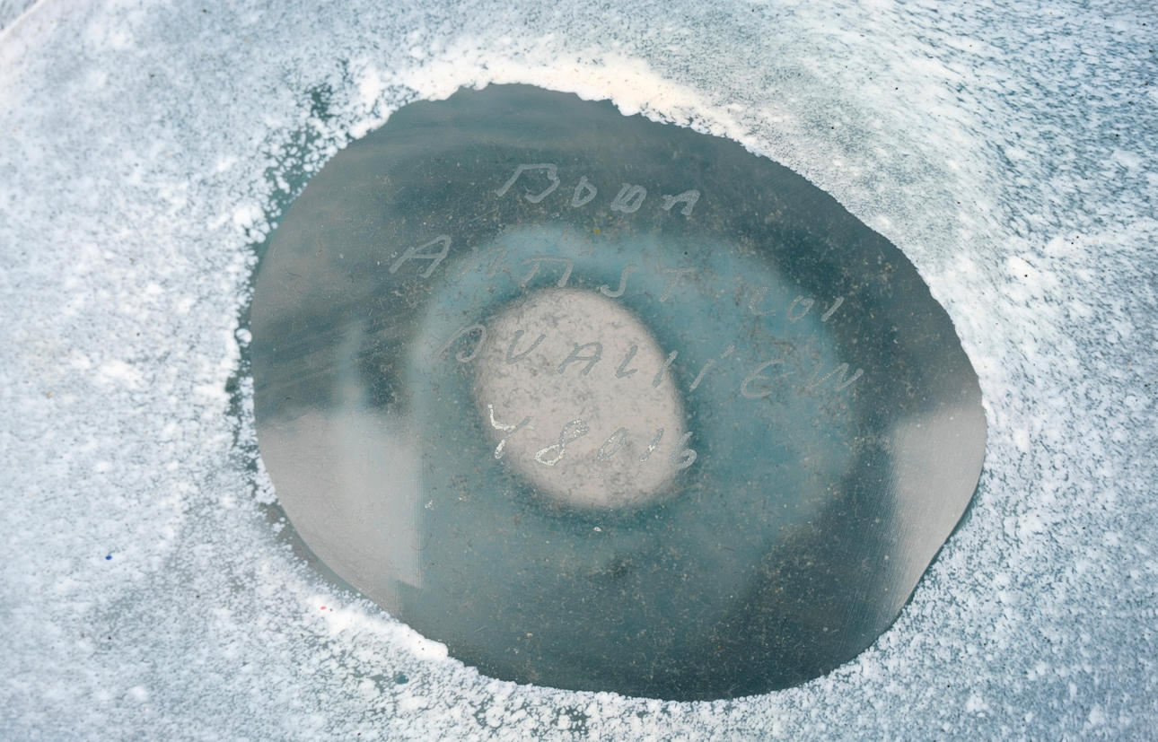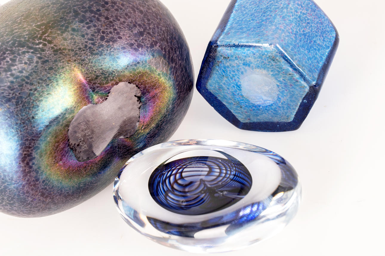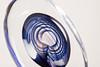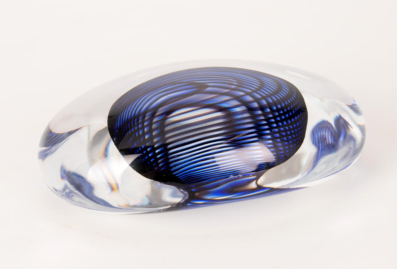 Pappersvikt/pappersvikt, blå spiral innesluten i en oval av klart glas. Signerad 'B Vallien' nedan, ca H 4 cm.