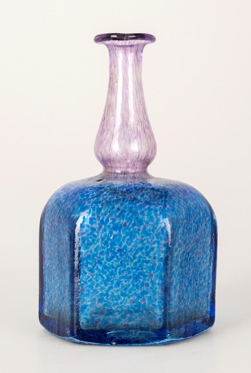 Handblåst flaska, blå och lila glasmassa, sexkantig kropp och balusterformad hals med utsvängd mun. Signerad nedan 'Boda Artist Col B Vallien 47835', ca. H 15 cm.