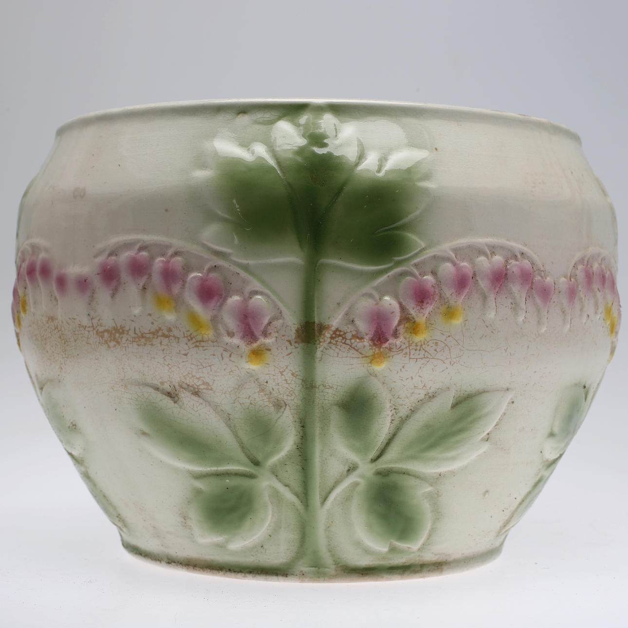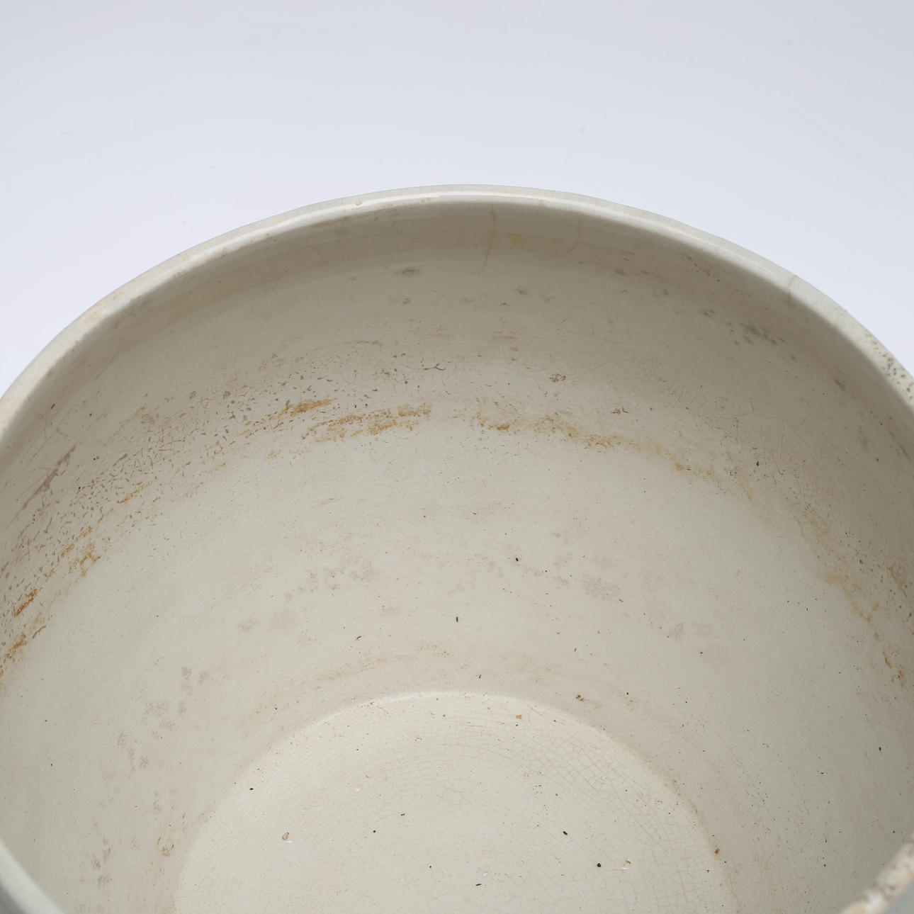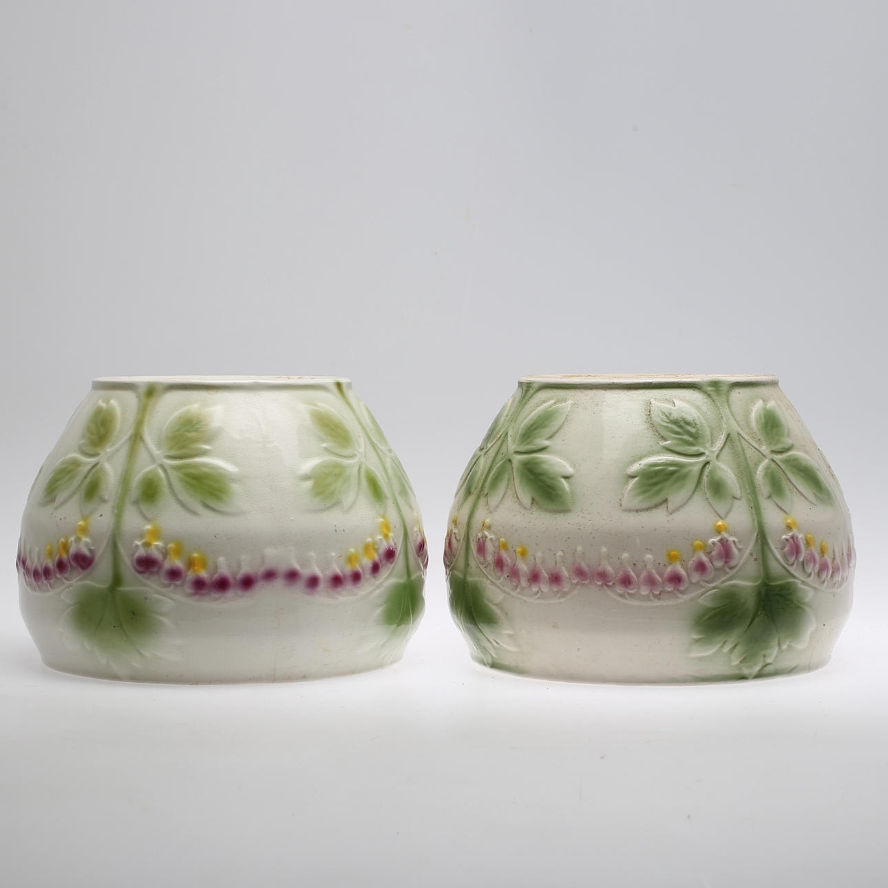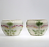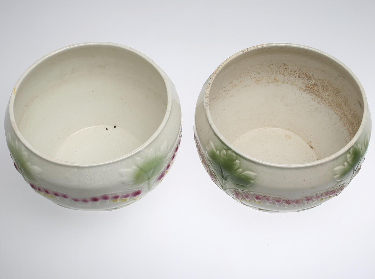Båda med slitage och mindre sprickor, ena krukan har även misfärgningar.