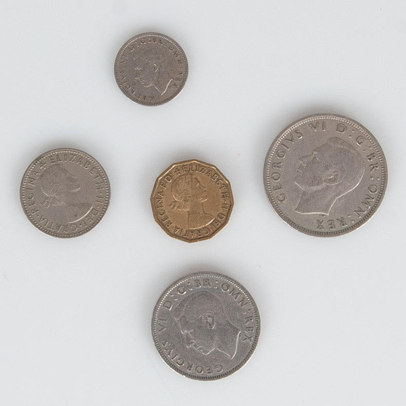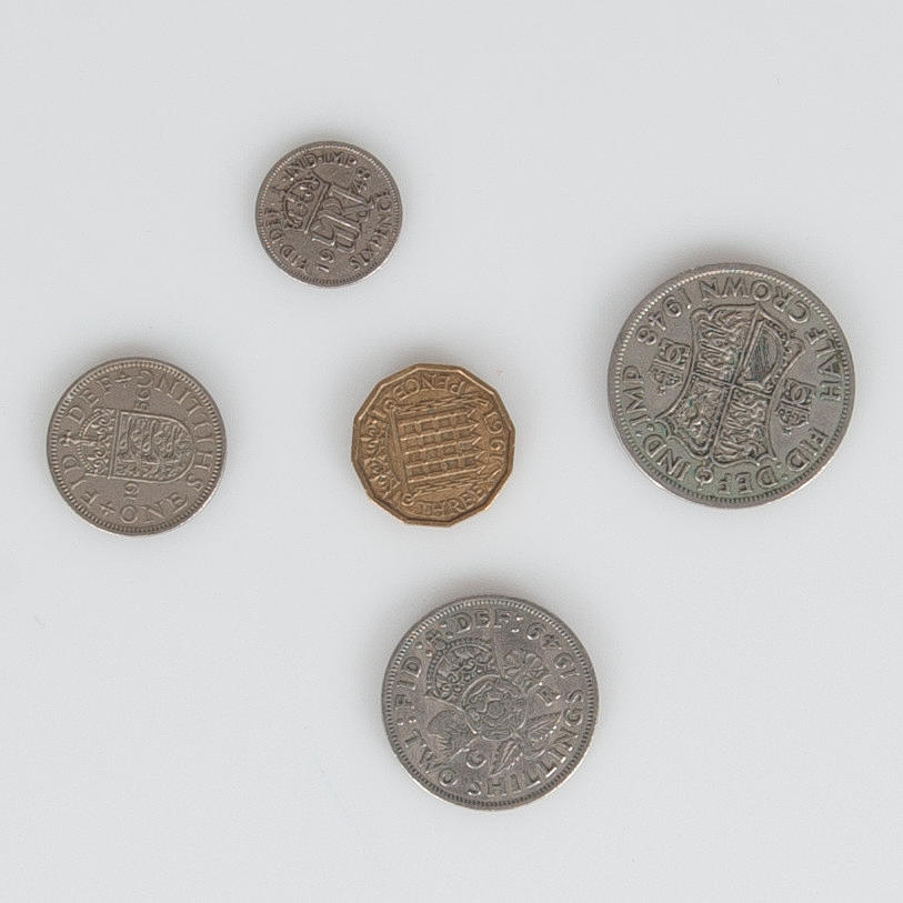 3 Pence 1937-1967 6 pence 1947-1967 1 shilling 1947-1967 2 shilling 1947-1967 samt Half Crown.