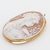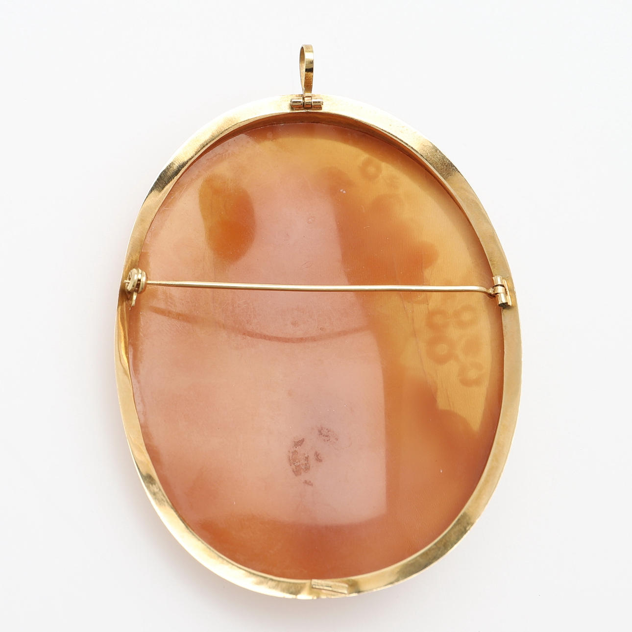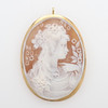 Snäckkamé med skuren dekor föreställande klassicerande kvinna, fattad i 9k guld, höjd ca 7 cm, vikt 15,4 gram.
