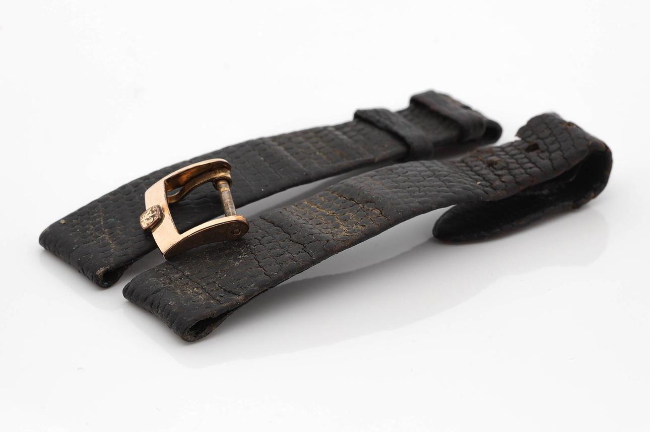 Tillhörande original sölja och defekt band i läder medföljer.