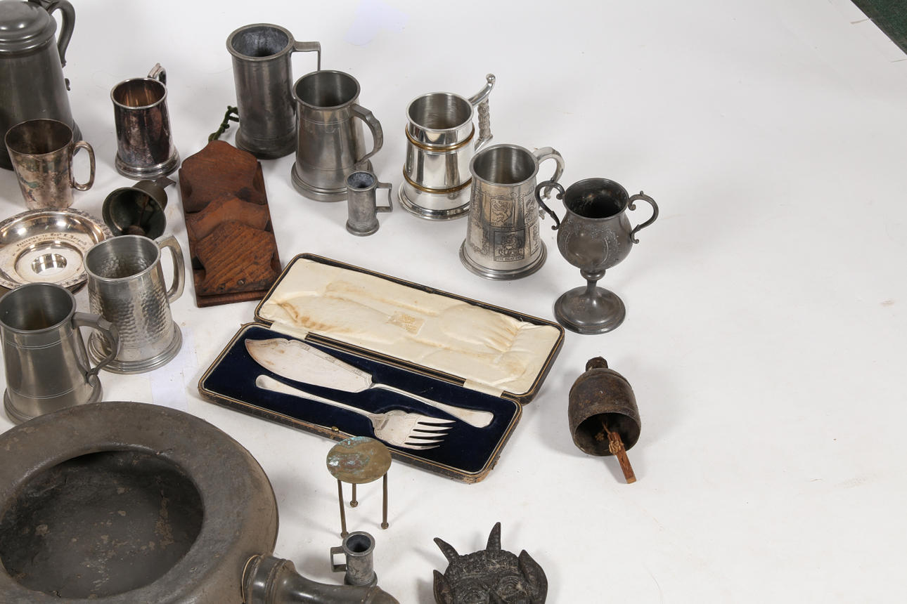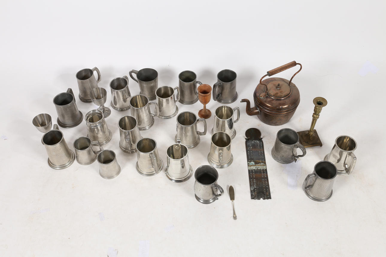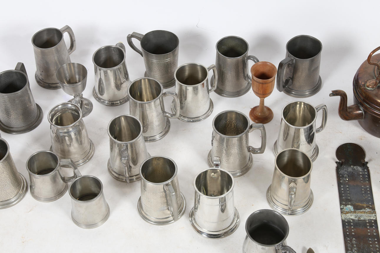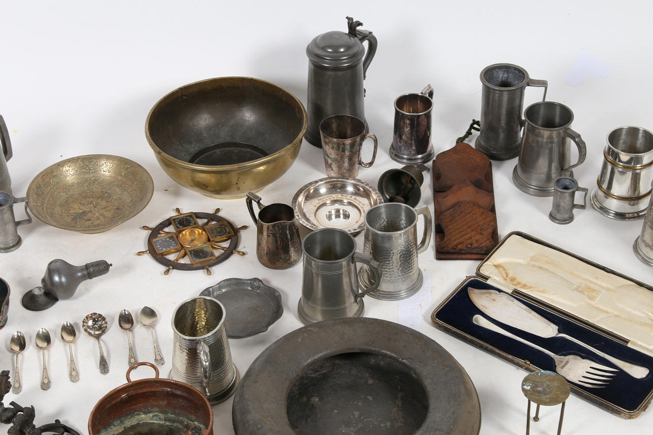 En mycket stor samling metallvaror för att inkludera tankardsskålar etc.