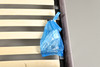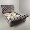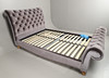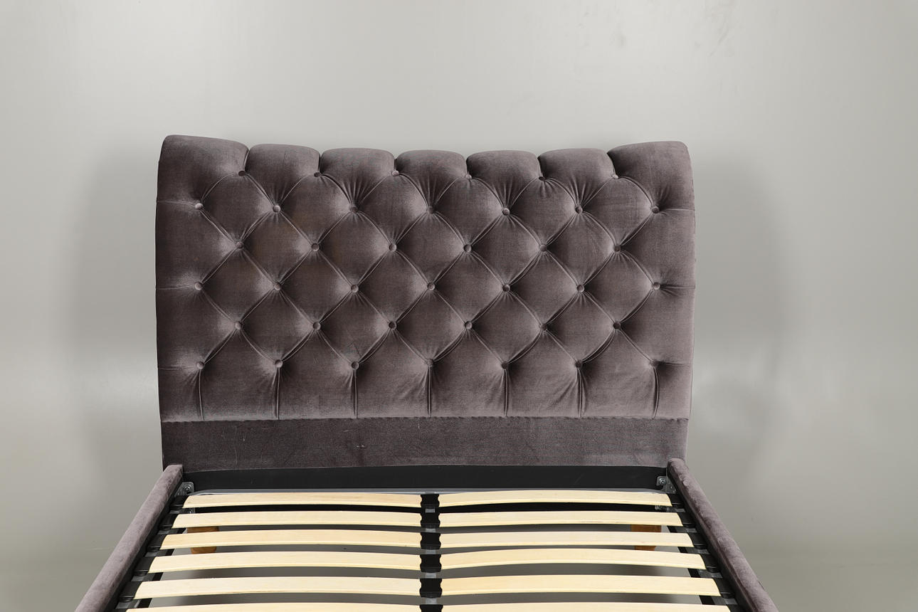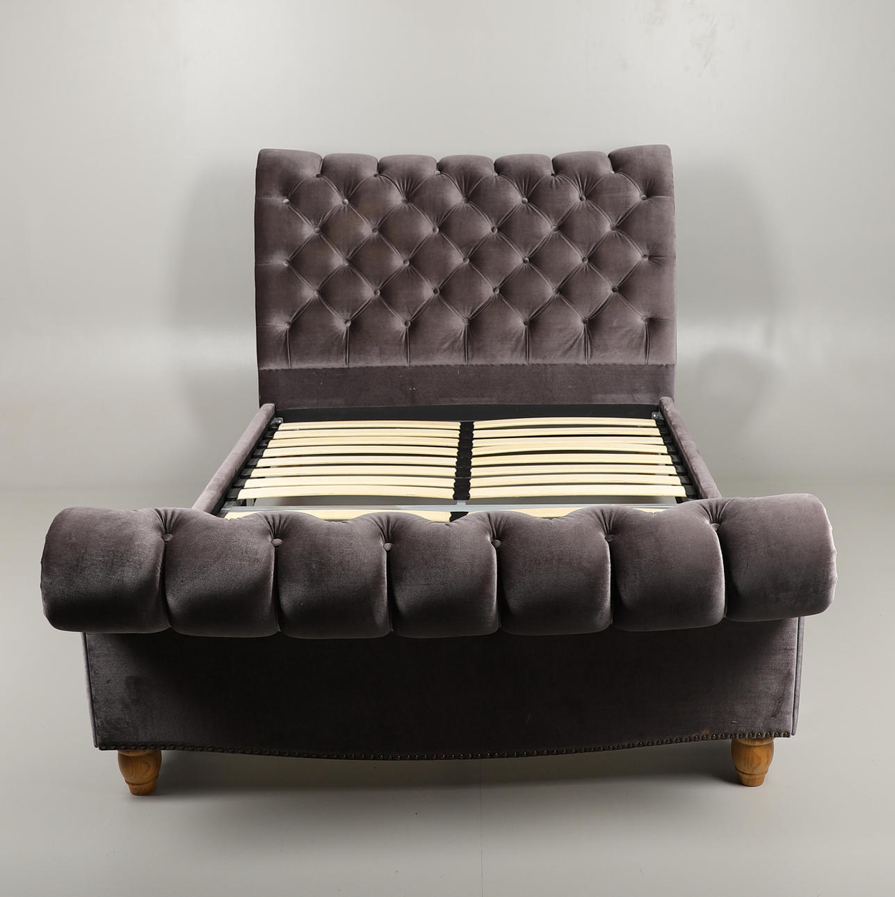 Med grå/blå Knappbaksida och metallbelagd klädsel i varje ände och åt sidorna. Lamellbotten, upphöjd på träfötter och inkluderar fästen. Totala mått: Höjd 123cm x Längd 255cm x Djup 148cm. Madrass område 193 cm x 137cm.