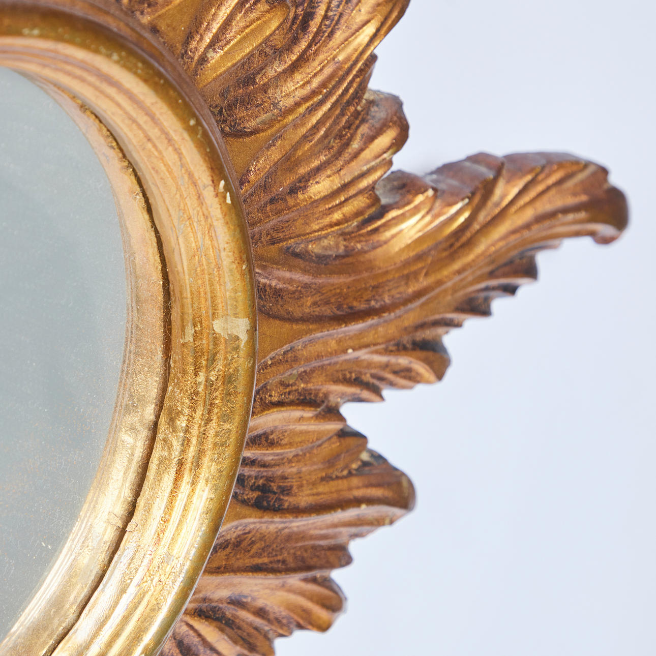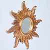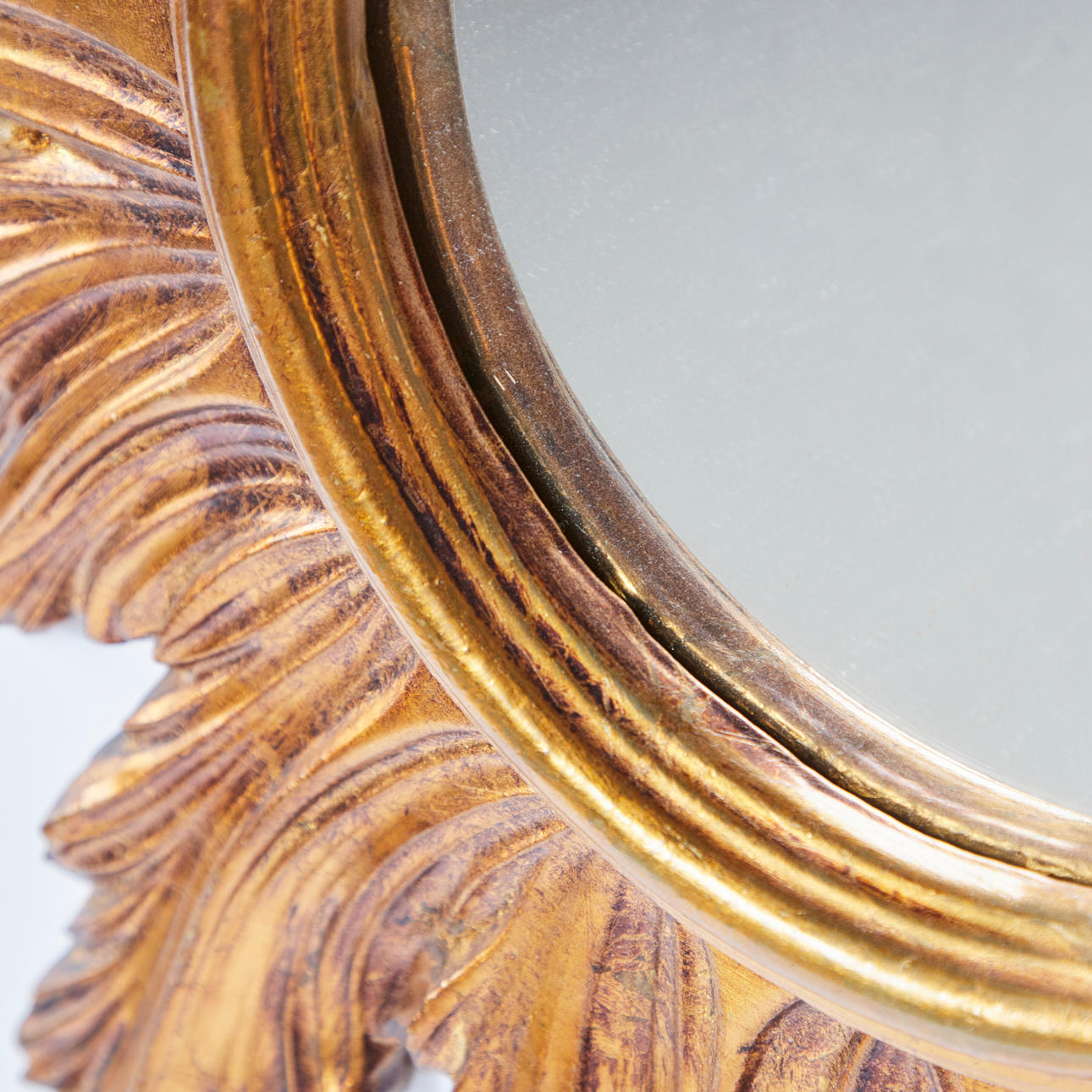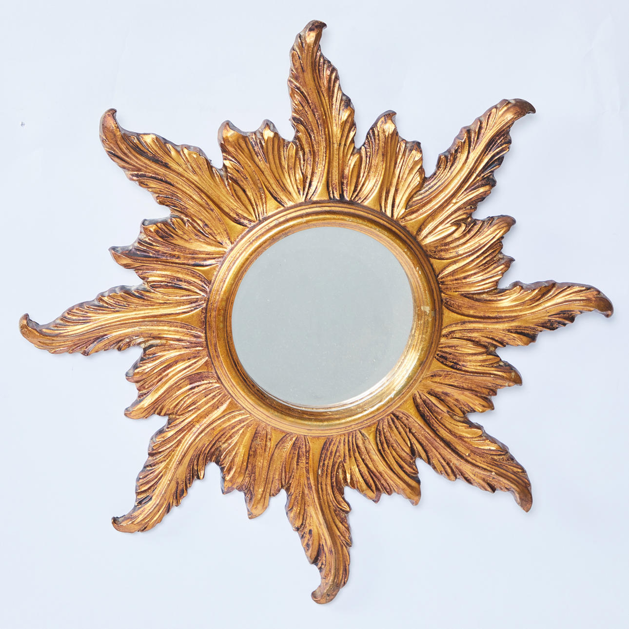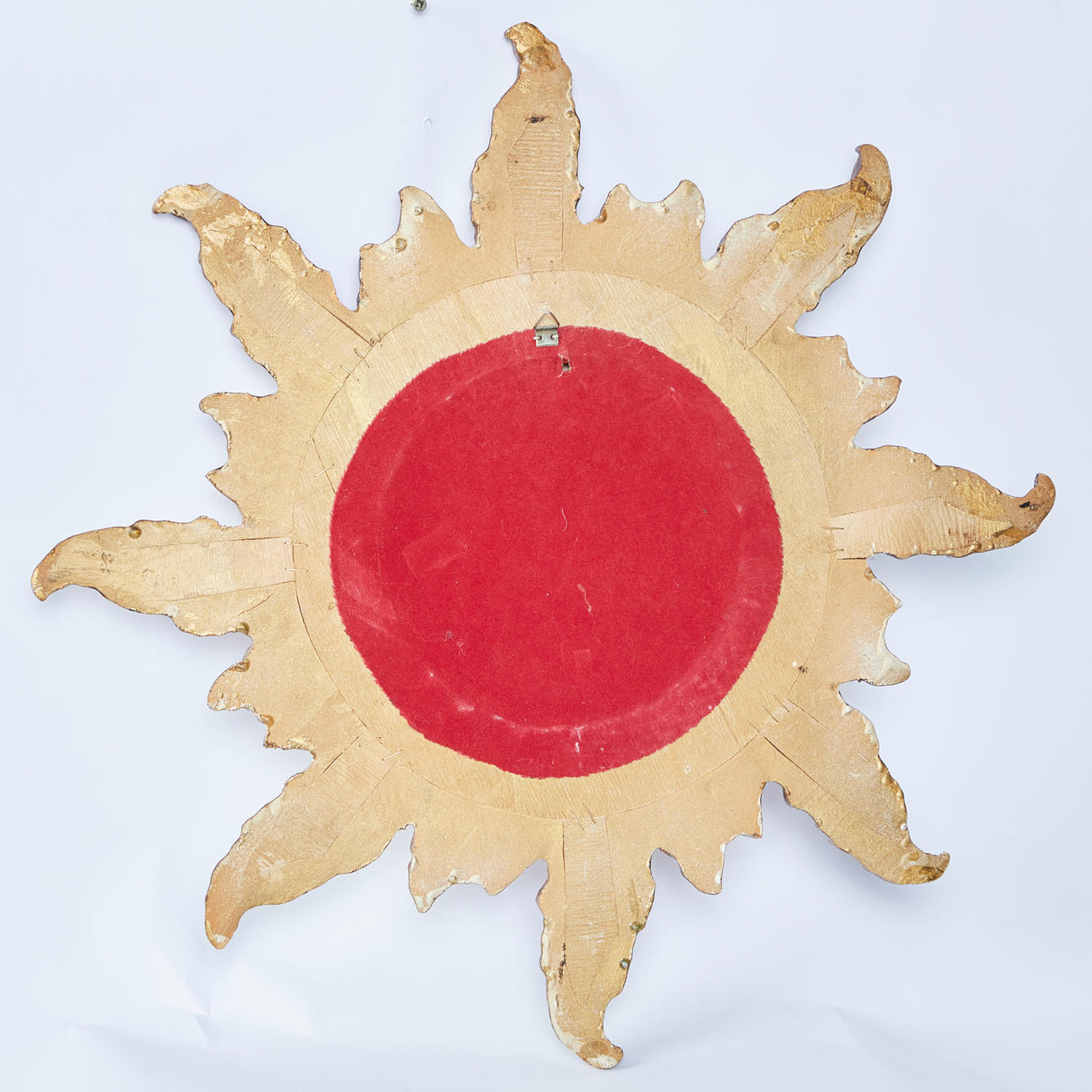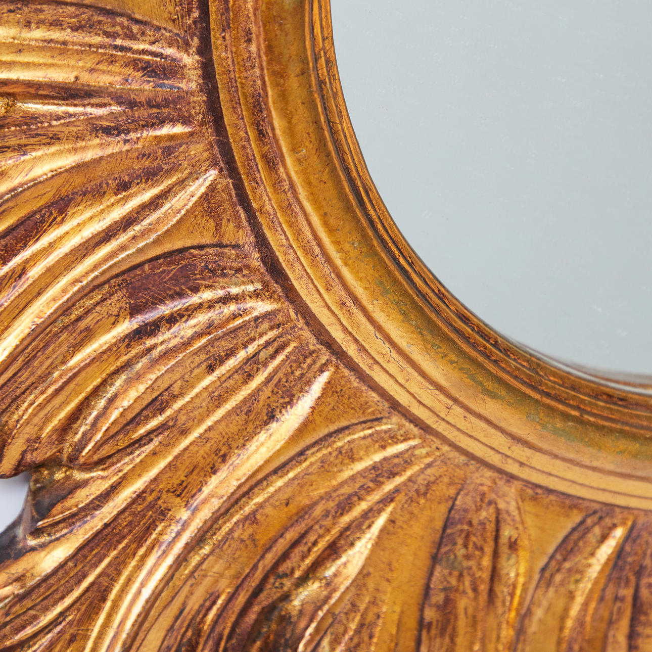 Väggspegel/solspegel, trä, glas, 1960-tal. Väggspegel med rund spegelyta och en solformad ram av guldlackerat trä, D.57cm.