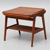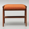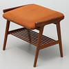 Mörkt trä, stoppad orange sits, multifunktion med vändbar sits / bordsskiva, underliggande tidningshylla. Höjd 42 cm, längd 50 cm, djup 42 cm.
