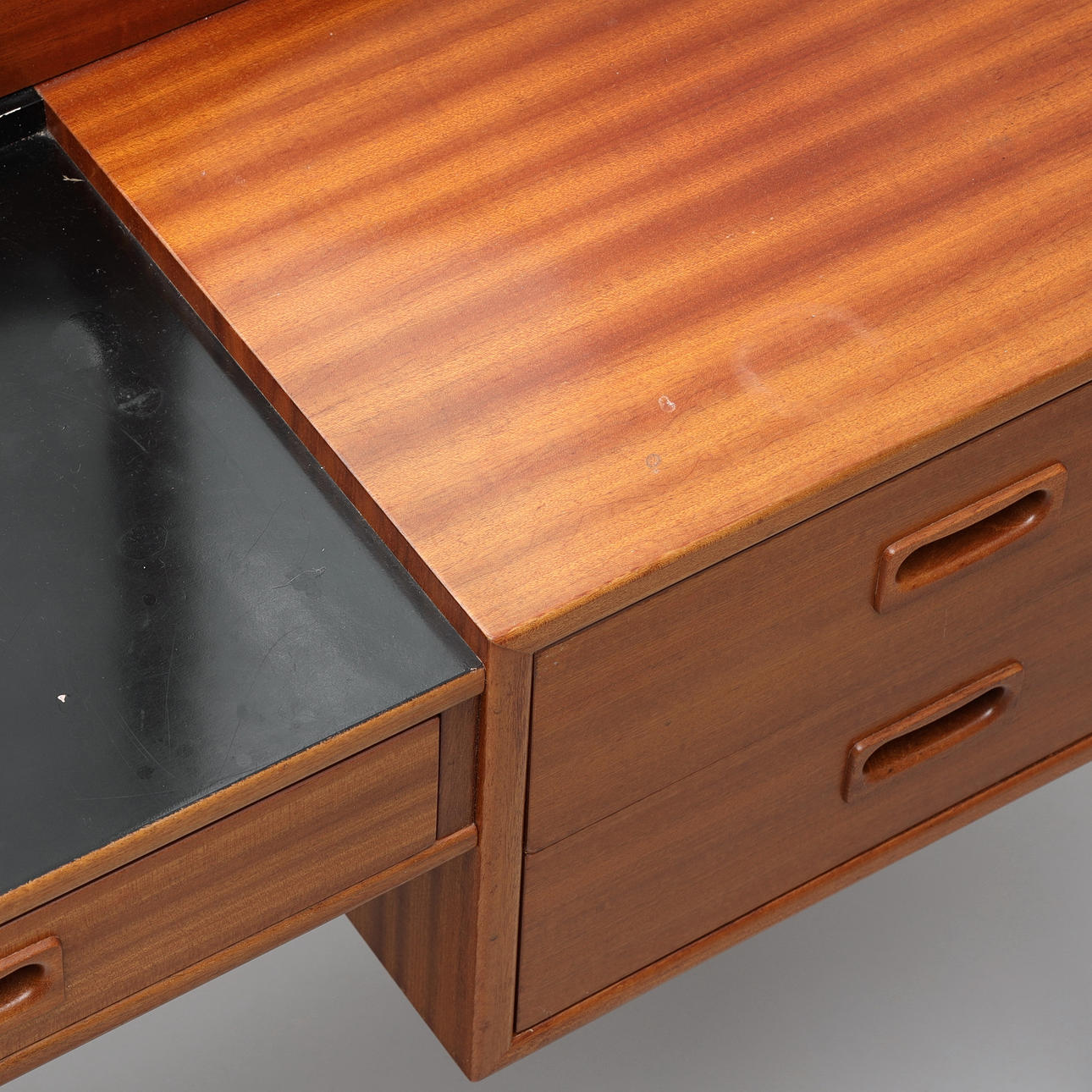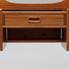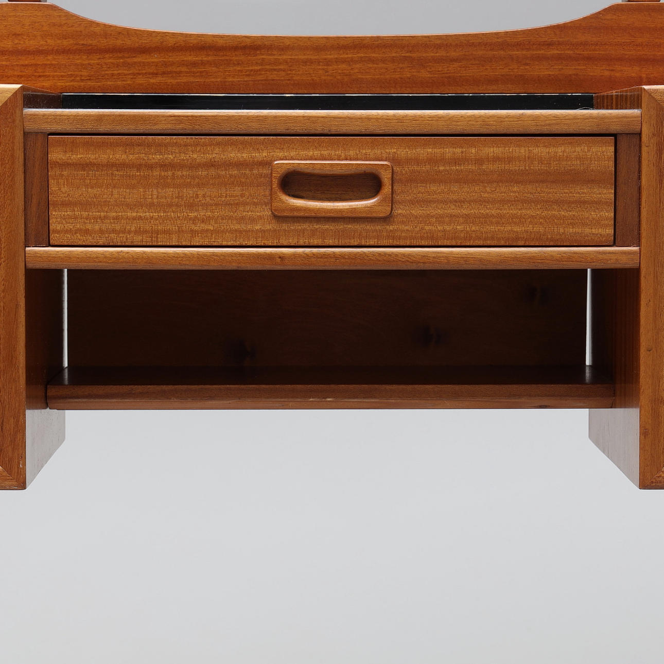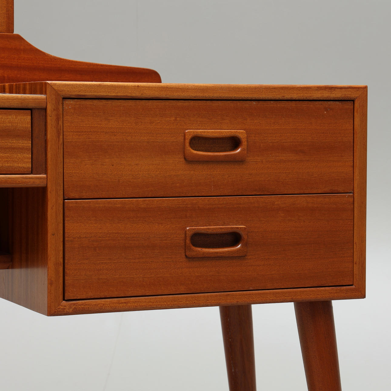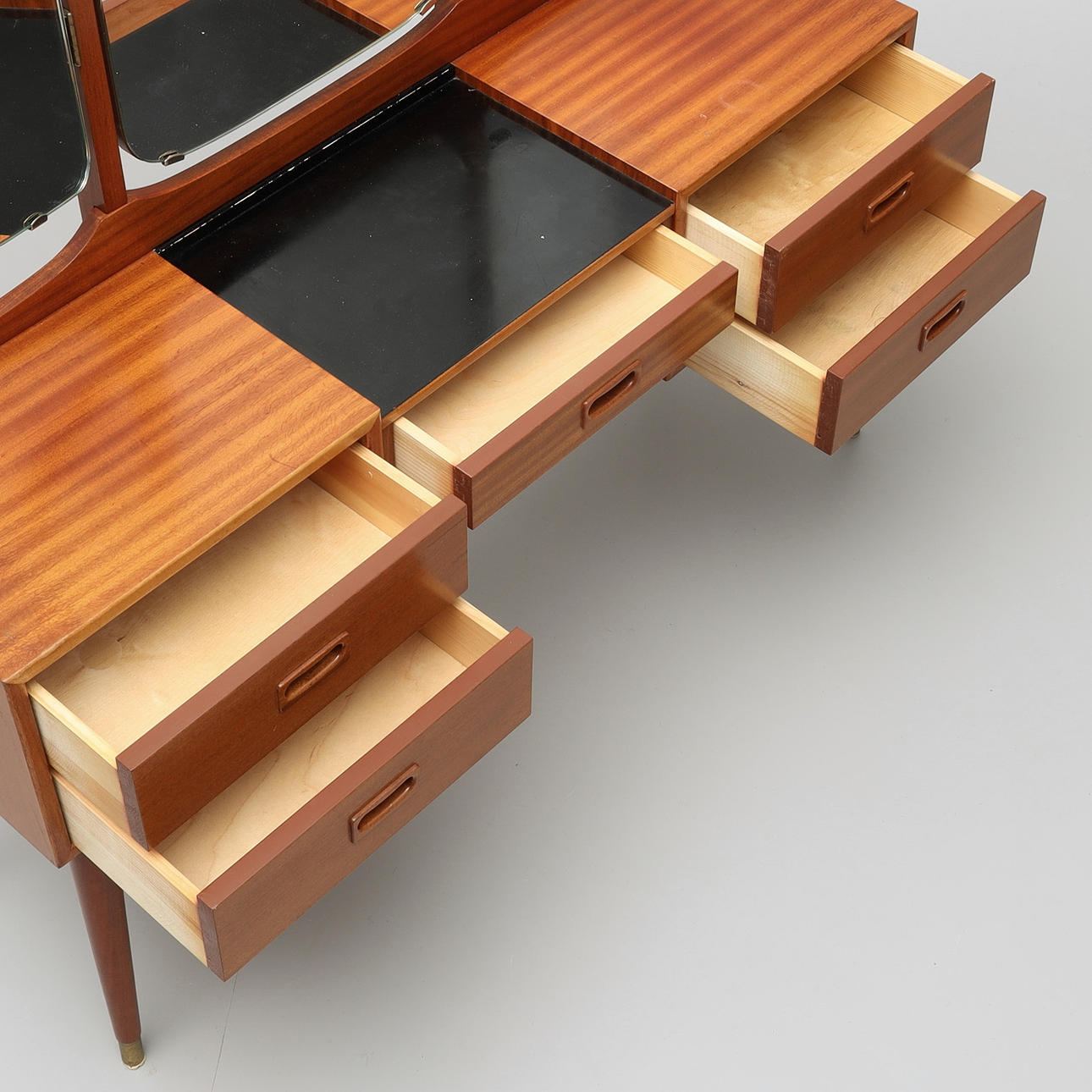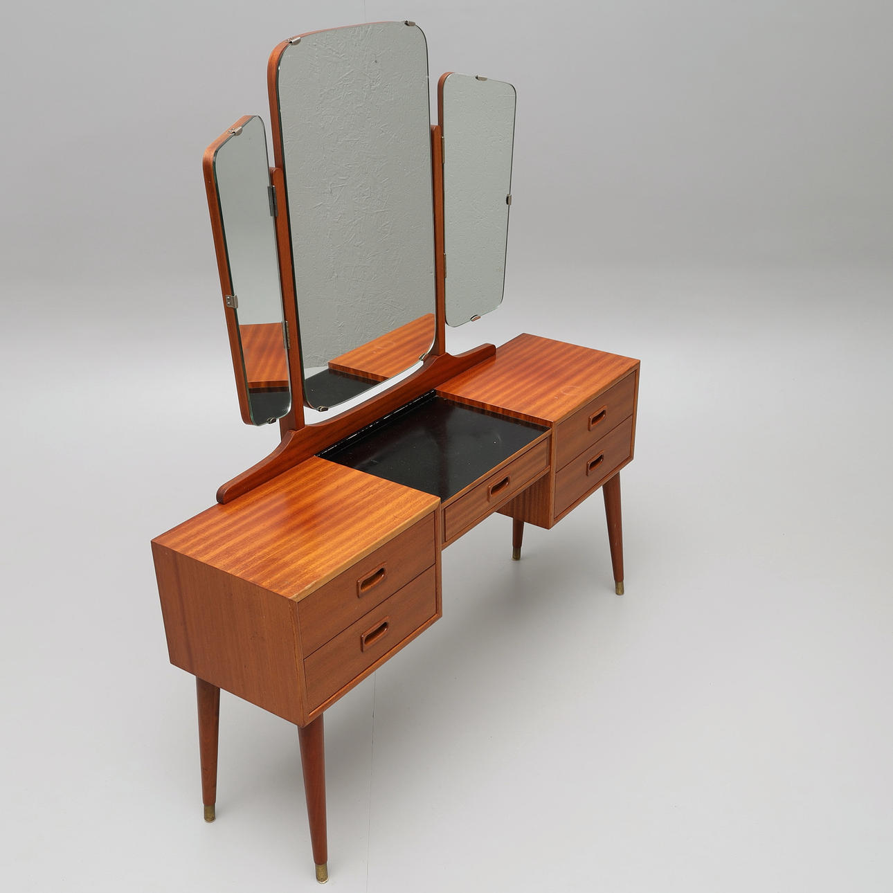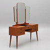 Sideboard med löstagbar tredelad spegel, lådor, mässingsbenslut. Bredd 119 cm, djup 32 cm, bordshöjd 65 cm, totalhöjd 140 cm.