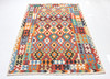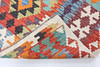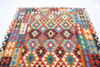 Flatvävd persisk matta av kelimtyp i ull på bomullsvarp, traditionellt mönster i modern färgskala.
