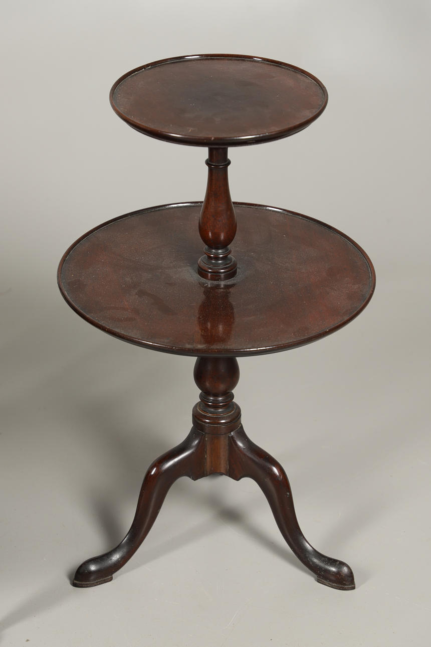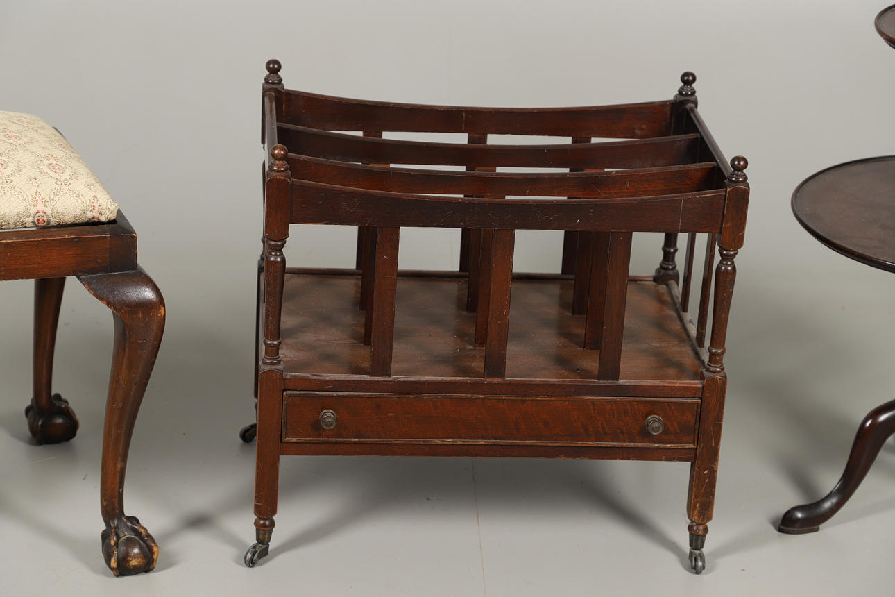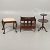 För att inkludera ett stativstativ i mahogny i två nivåer (höjd 64 cm x diameter 40 cm), en stoppad avtagbar sittpall på boll- och klofötter (höjd 48 cm) och ett trämagasinställ med vända stöd i varje hörn (höjd 53 cm x längd 56 cm x djup 35 cm) (3).