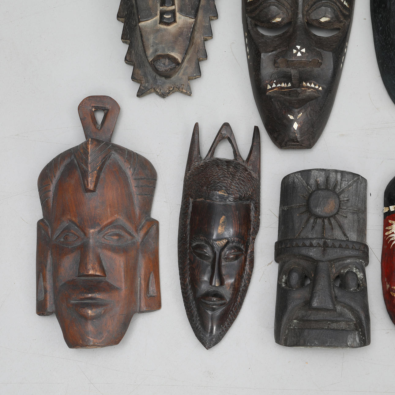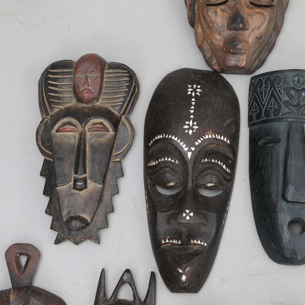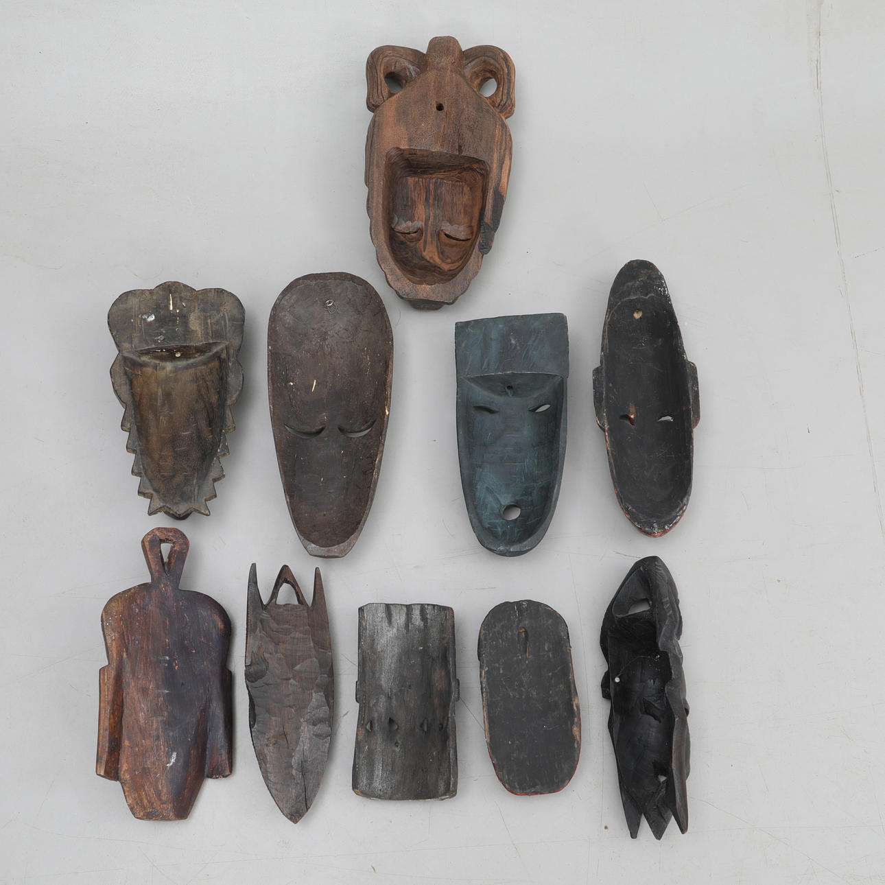 10 st olika masker i trä.