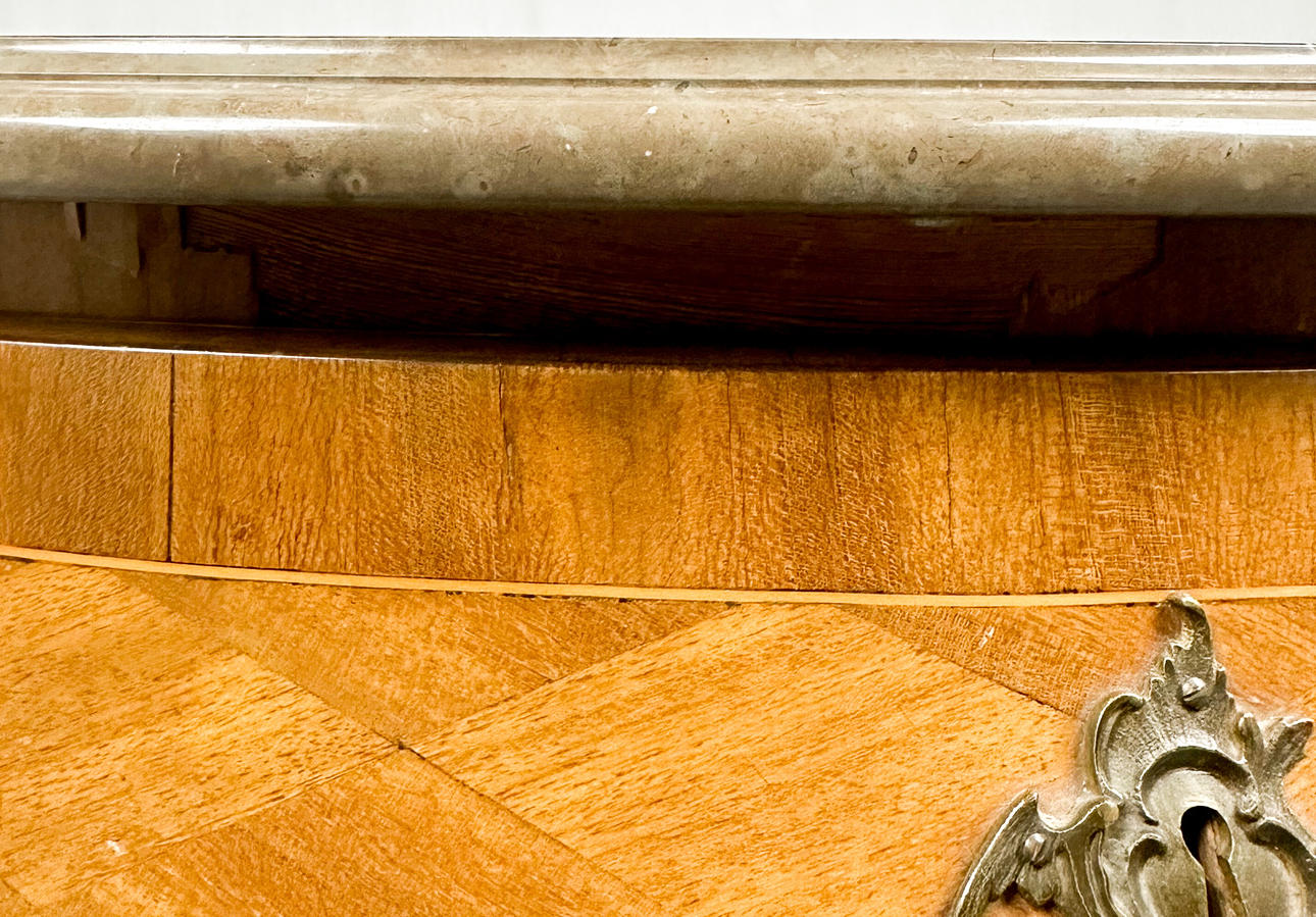Byrå med lös marmorskiva, tre lådor, beslag av mässing. Proviens Stockholm. Längd 120 cm Djup ca 60 cm Höjd 80 cm.