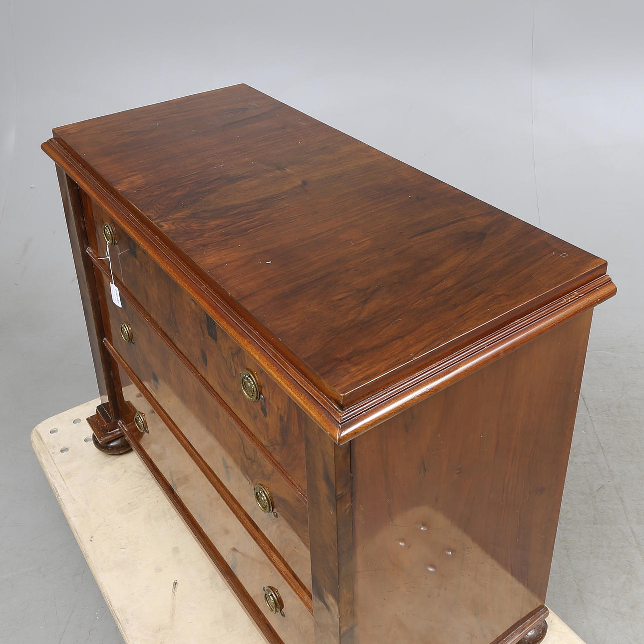 Fanerad med valnöt. Tre lådor. Längd 104, bredd 47, höjd 82 cm.