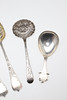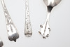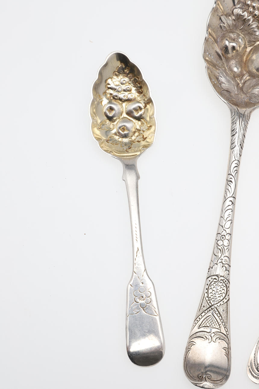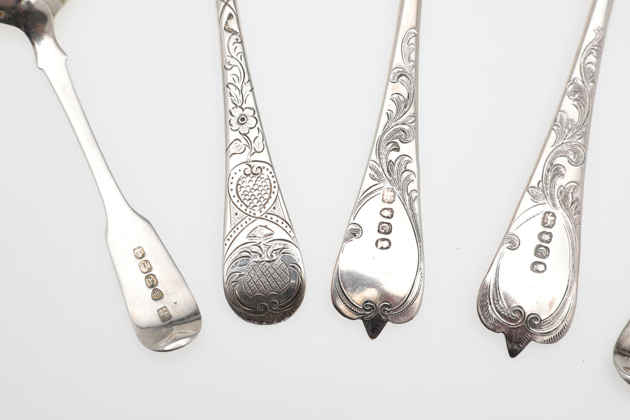 ett par George III skedar, London 1802, ett annat matskedstort exempel, en tesked, en silsked & en norsk sked, med graverad dekor, blandade makare & dadlar; 10ozt.