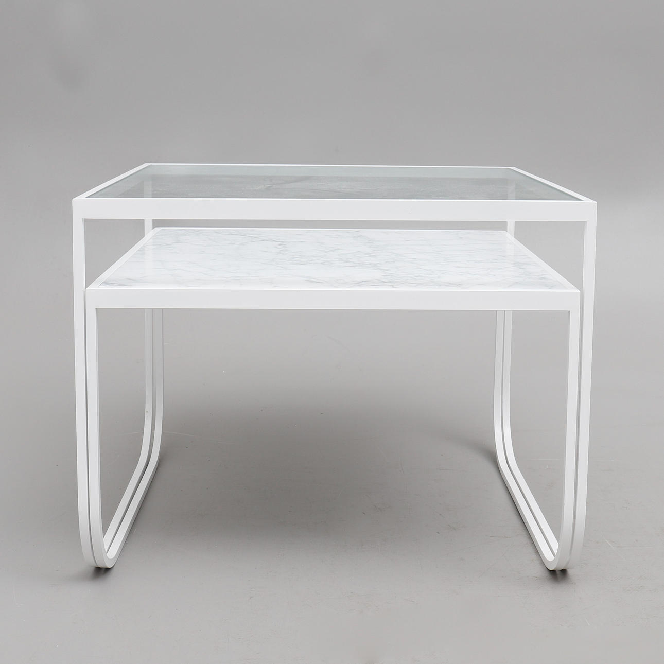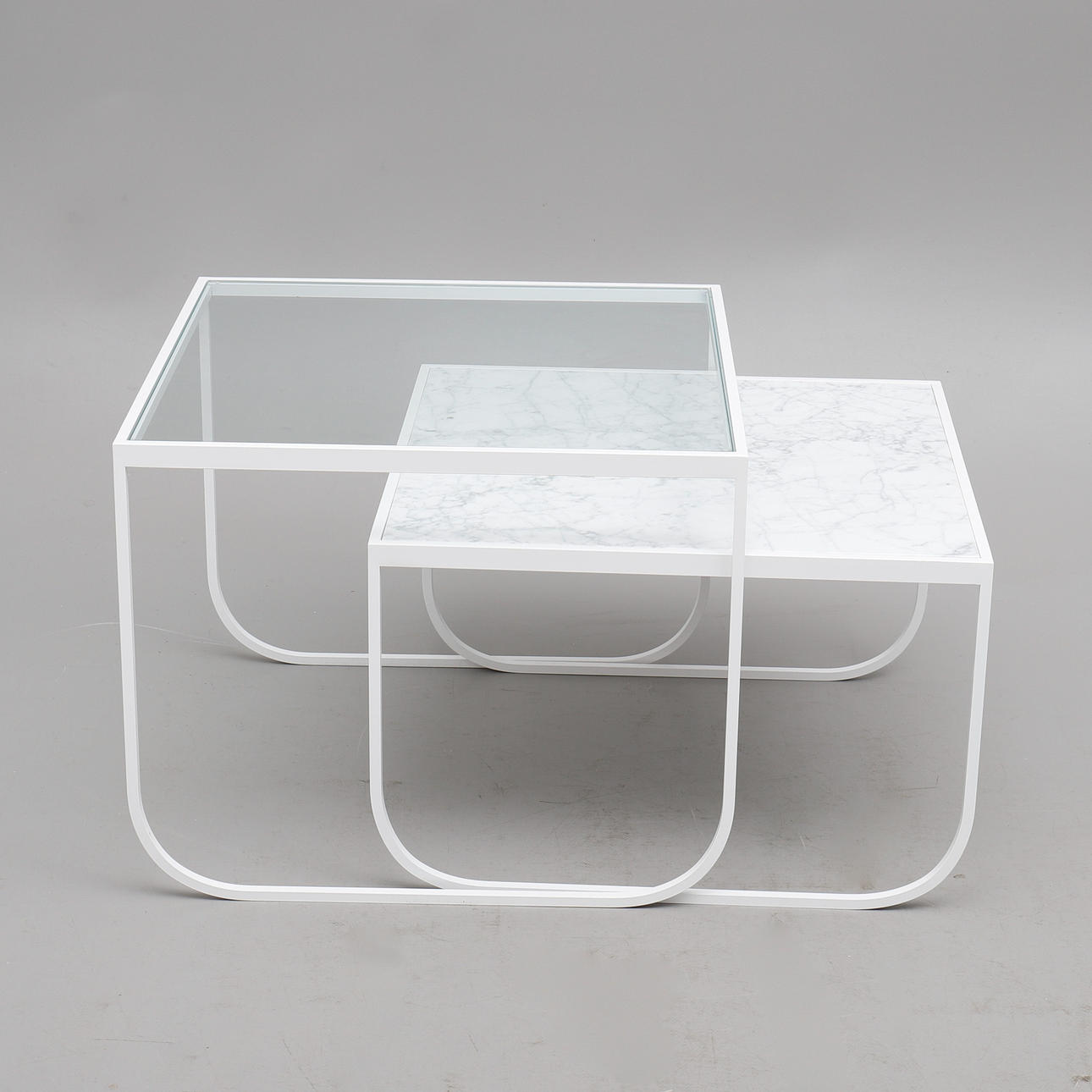 Tvådelad lackerad stålstomme varpå skivor av glas respektive carraramarmor, höjd 40 respektive 51,5 cm, skivorna 63x60 respektive 63,5x63,5 cm.