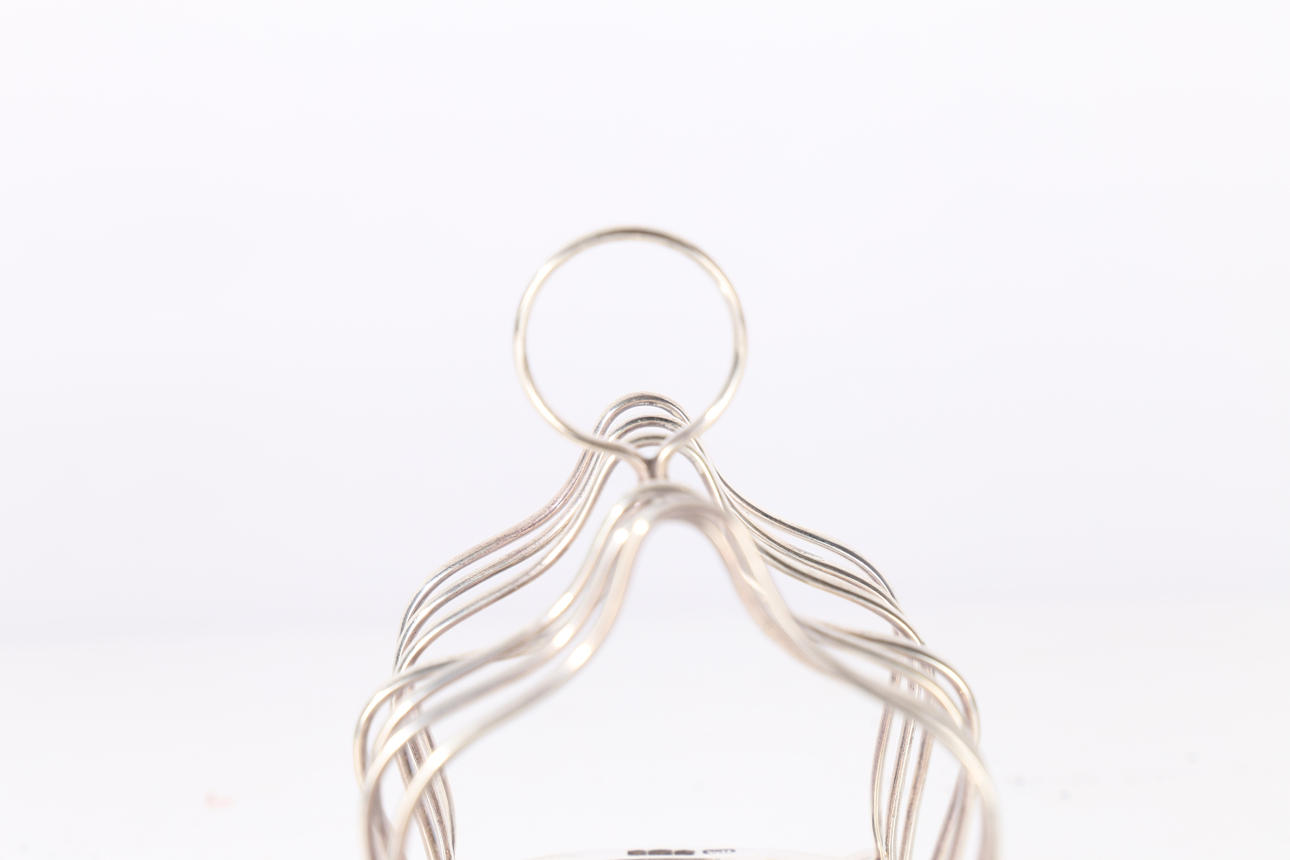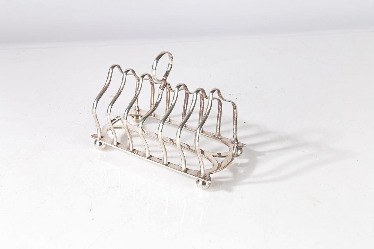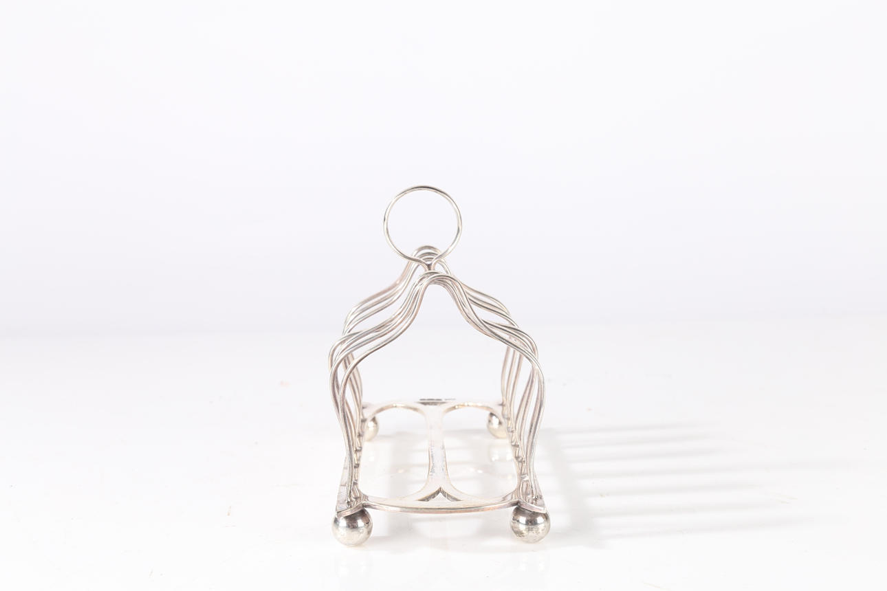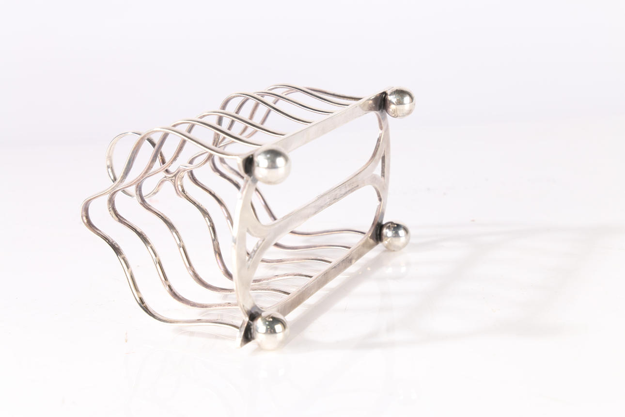En George V silver toast rack, stämplad Shefield 1925, med ett öglahandtag, 14cm bred vikt 5.64oz.