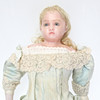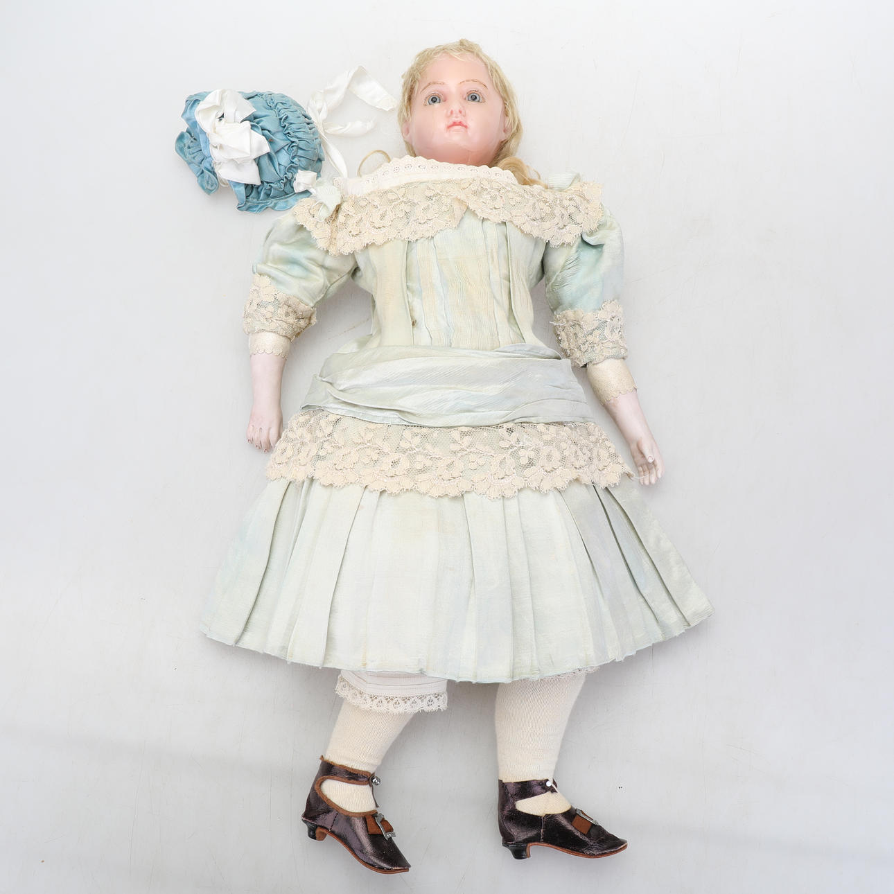 Docka med ljusblå klänning, märkt i nacken men otydligt, längd ca 55 cm