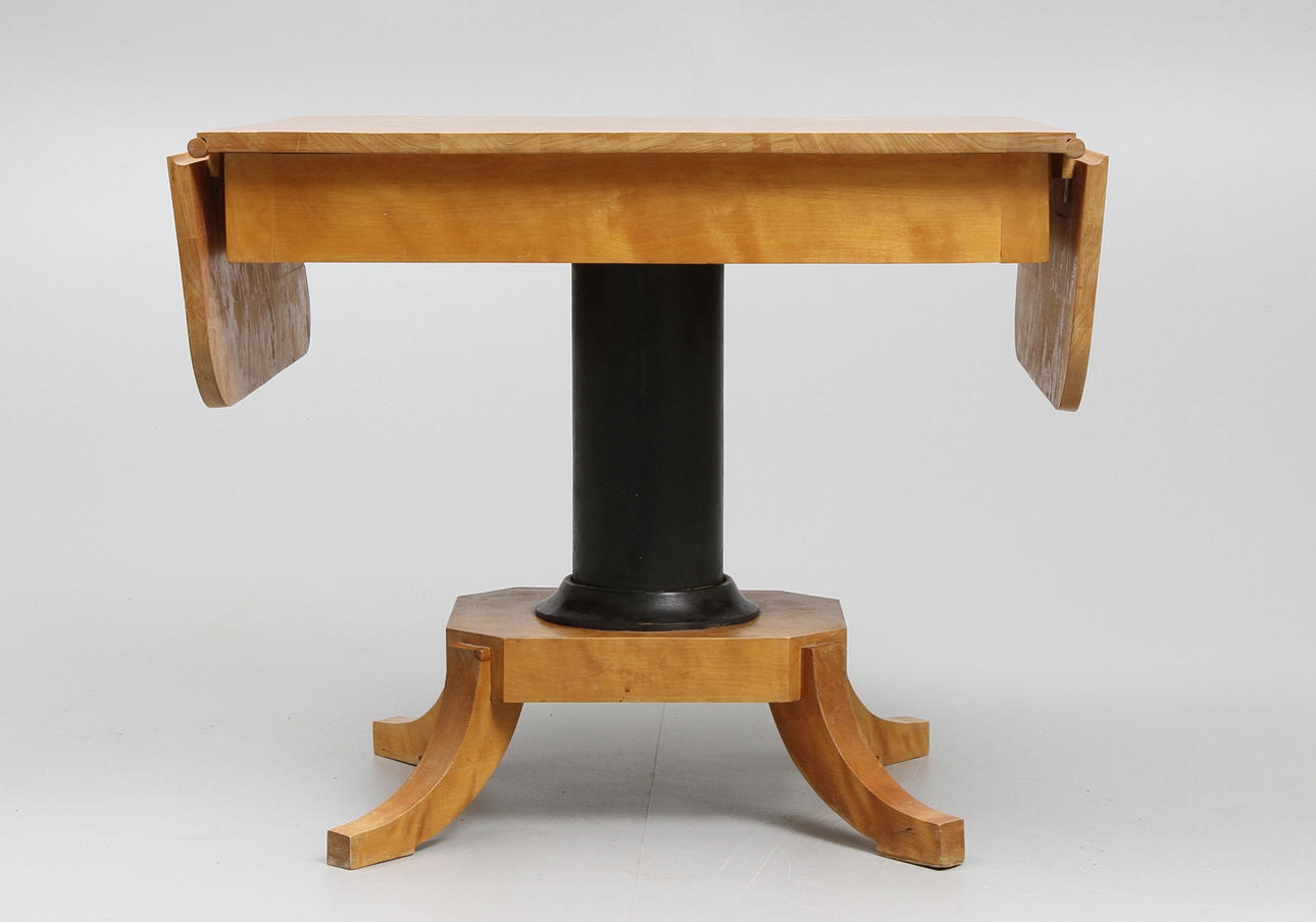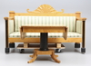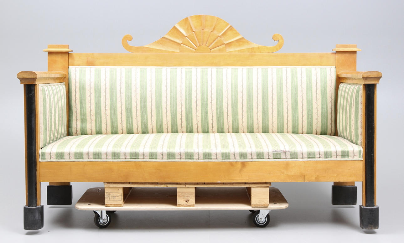 Björk, vävd vit/grön randig klädsel. Soffa med skuren solornamentik och svärtade pilaster kolonner. Längd 190, bredd 73, höjd ca 120 cm. Bord med svärtad pelarfot och klaffar. Längd 85+50, bredd 68, höjd 75 cm.