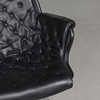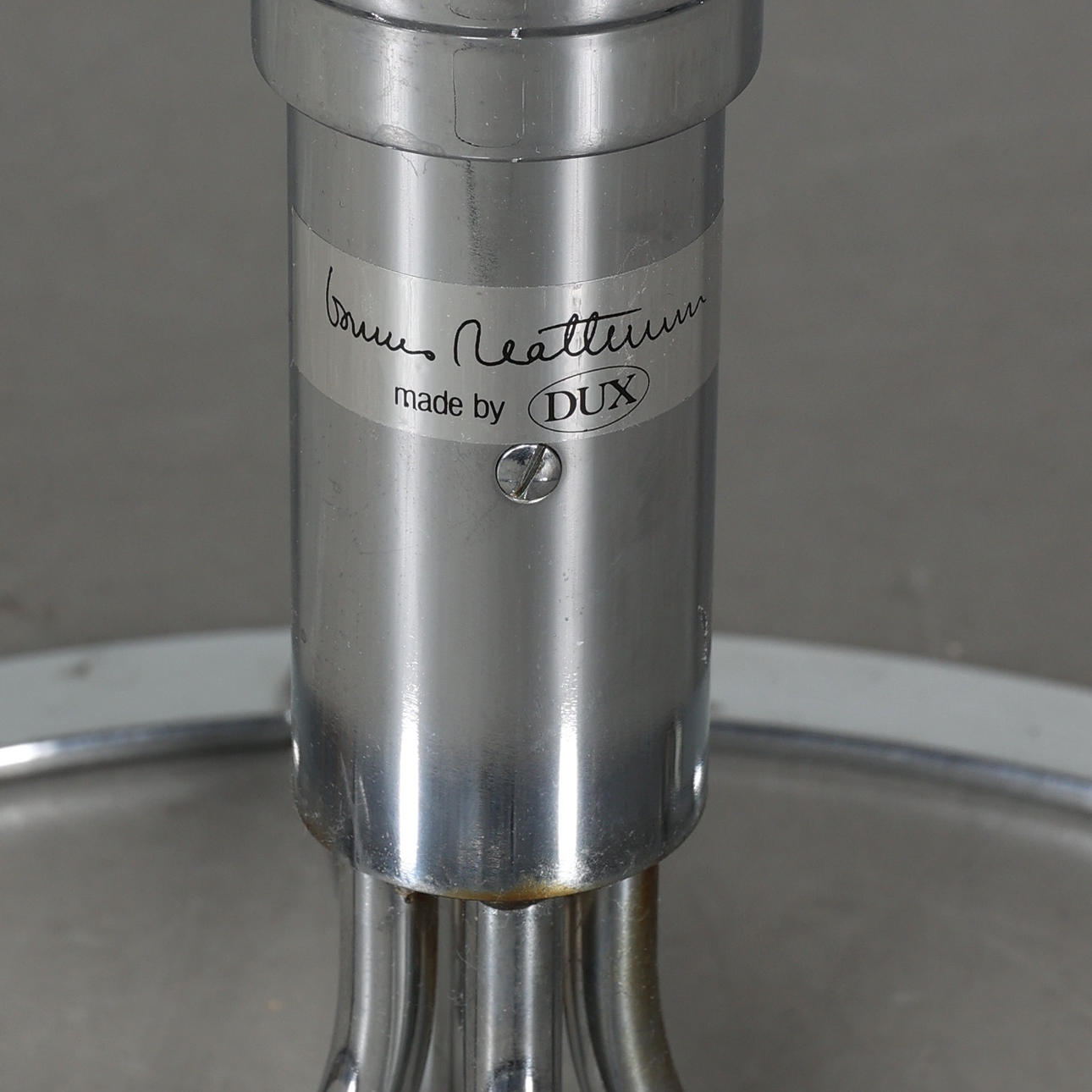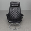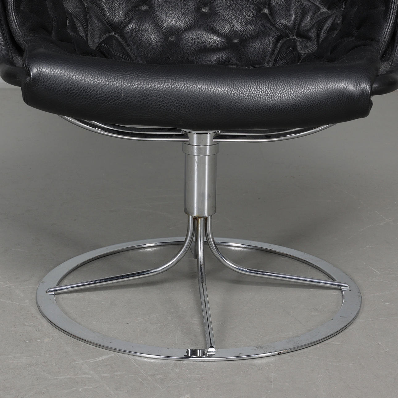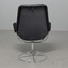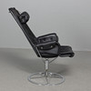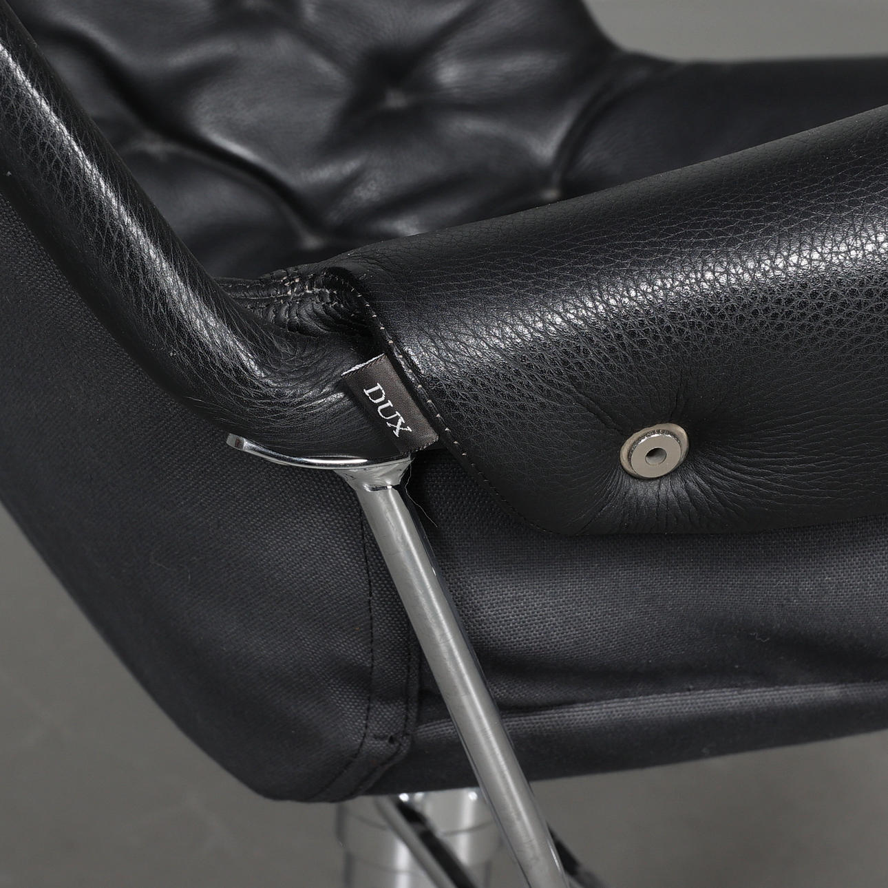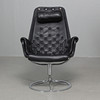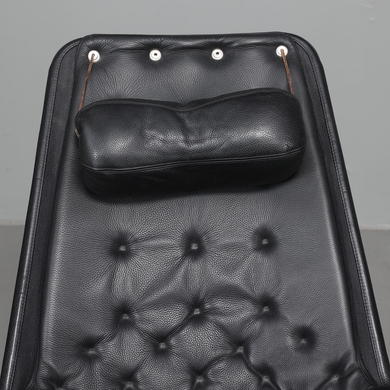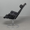 Fåtölj med stomme i kromat stål. Säte i svart textil, dyna samt nackkudde klädda i svart läder. Etikettmärkt på bas.