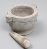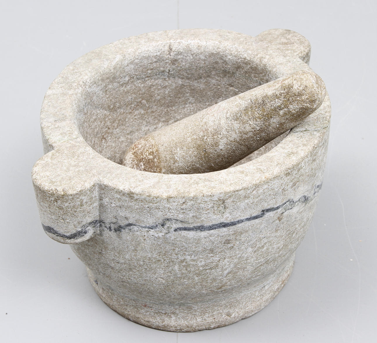 Sten mortel med handtag och stöt. Längd 34, höjd 19 cm.