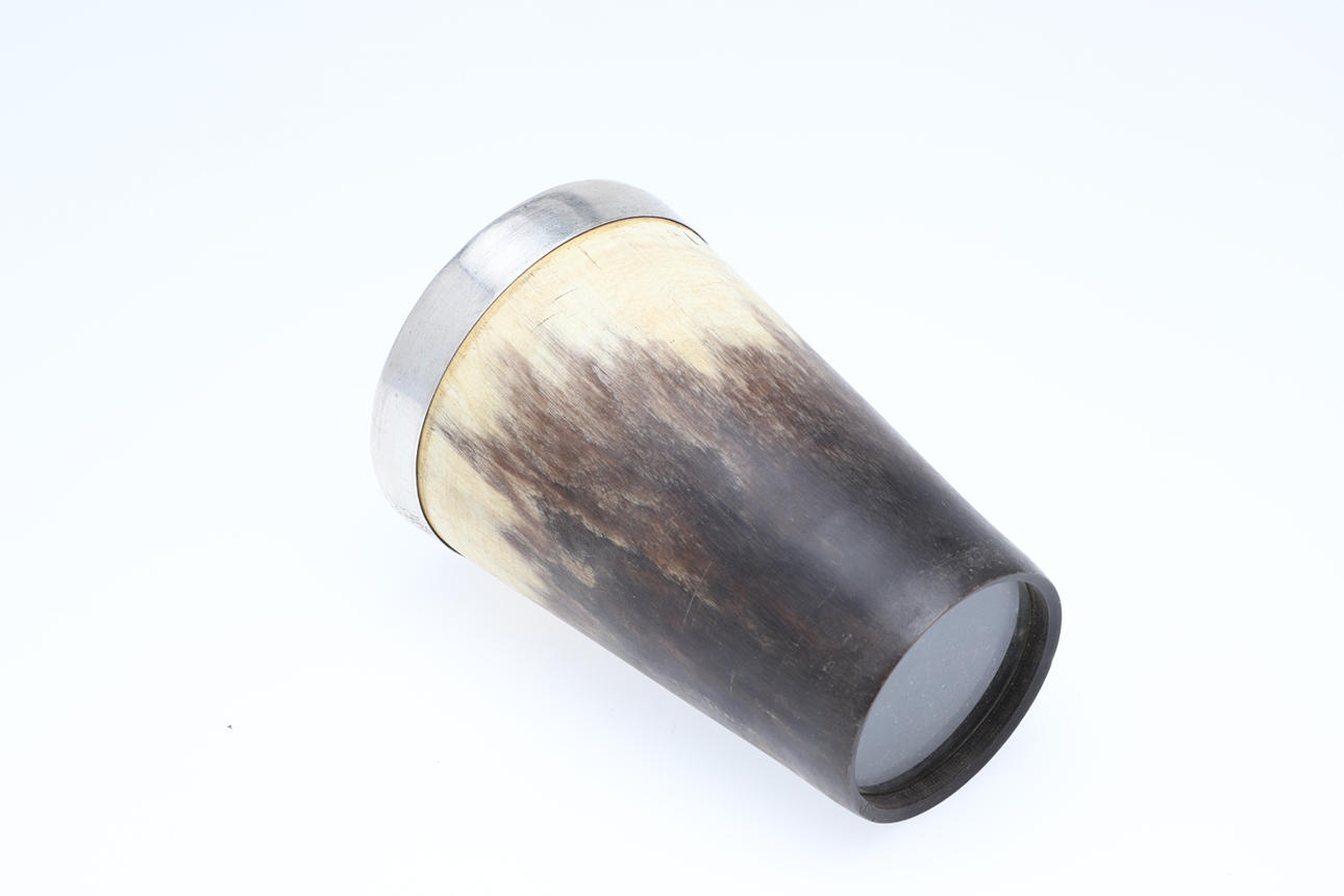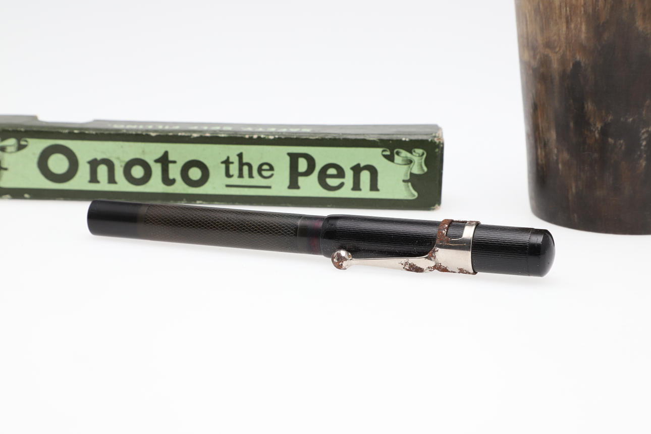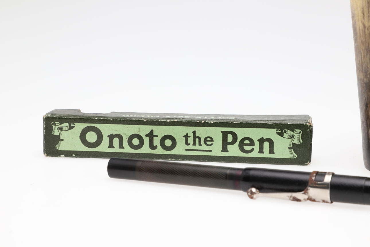 paraferad, slitna märken, samt boxad reservoarpenna ”Onoto The Pen”; bägaren 4.25" (11cm) hög (2).