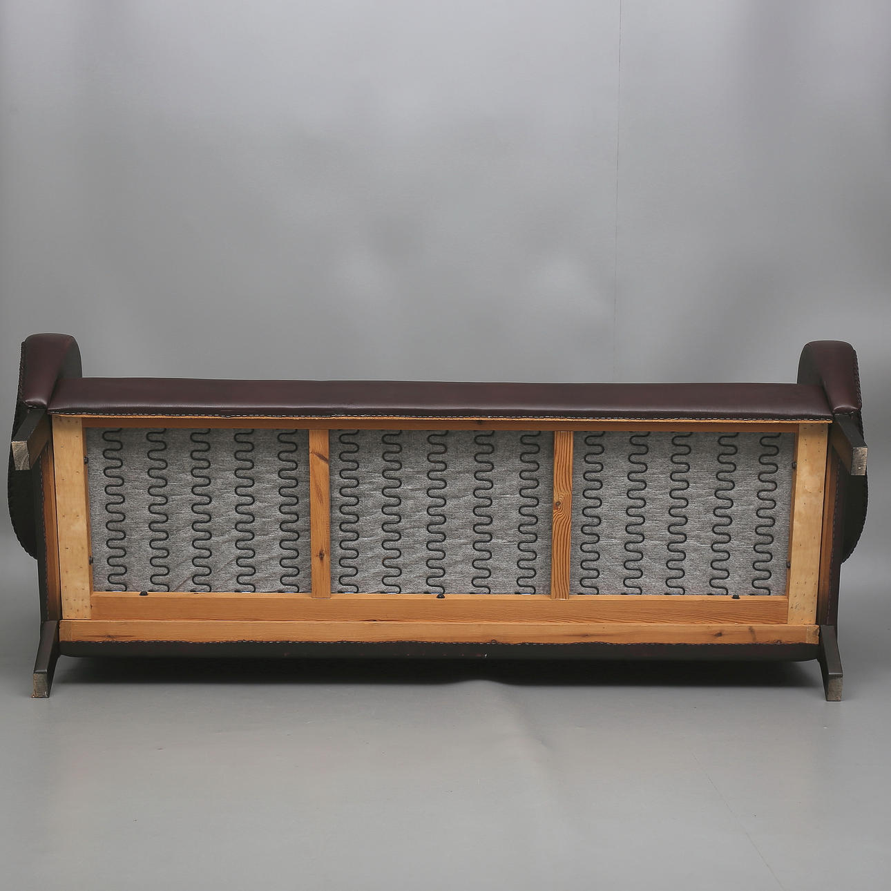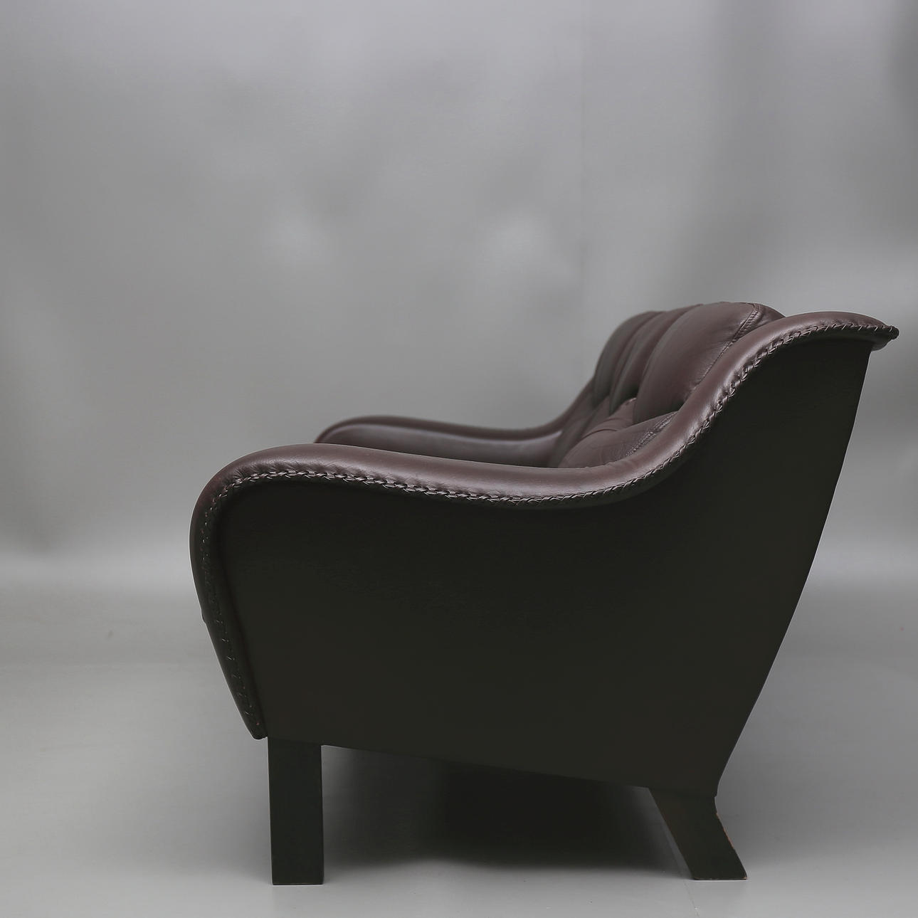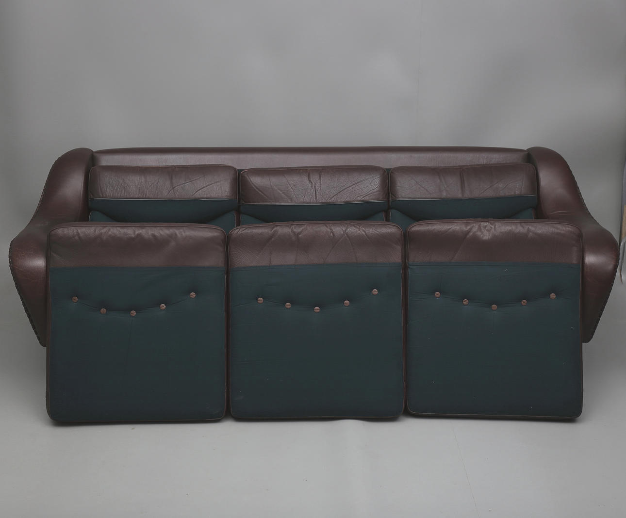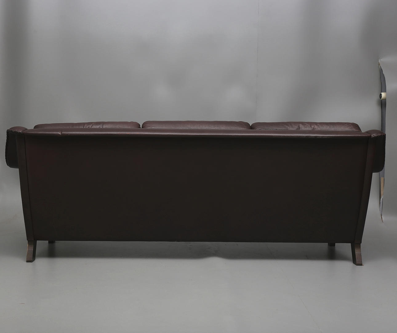 3-sits soffa med lösa rygg och sittdynor. Detaljer med söm i skinn. Längd ca 215 cm. Bredd ca 85 cm. Höjd ca 74 cm.
