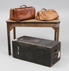 Koffert med järnbeslag och läderhandtag. Längd 89 cm.