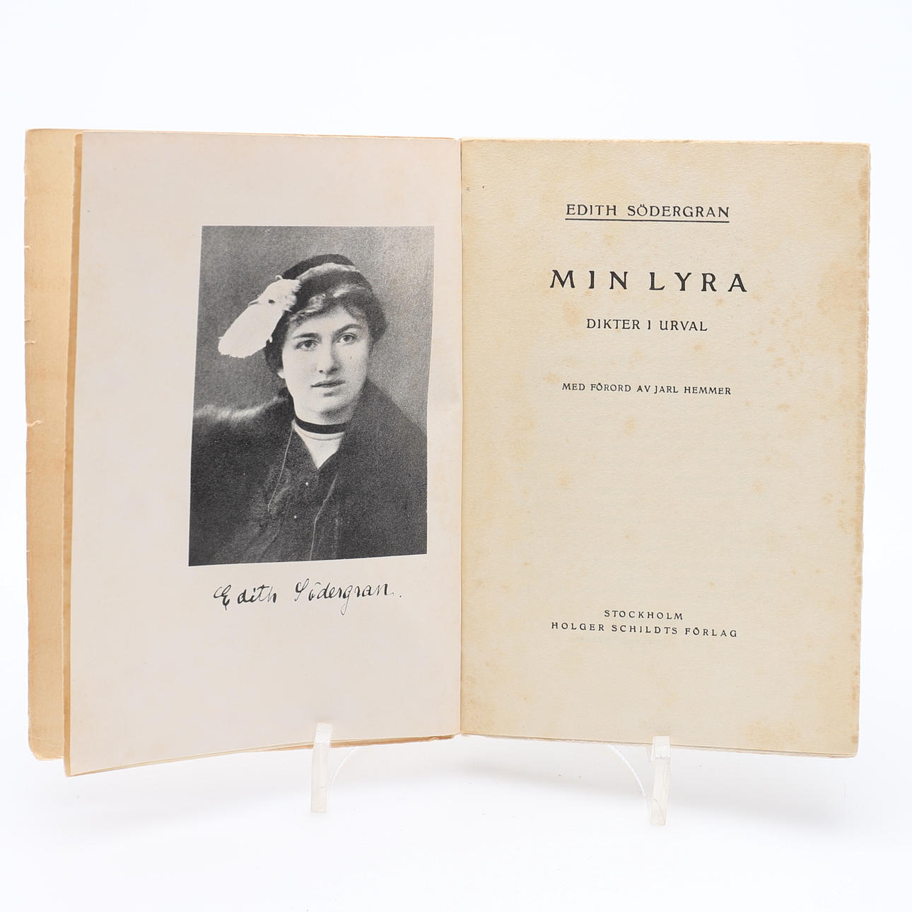 Södergran, Edith, finlandssvensk poet, (1892-1923). Min lyra. Dikter i urval med förord av Jarl Hemmer. Holger Schildts förlag, Stockholm, 1929. Häftad 8vo med omslag textat i svart oich med röd dekoration. Illustrerad med ett porträtt av Edith Södergran som frontespis. Frontespis, 133 sid. , (III).